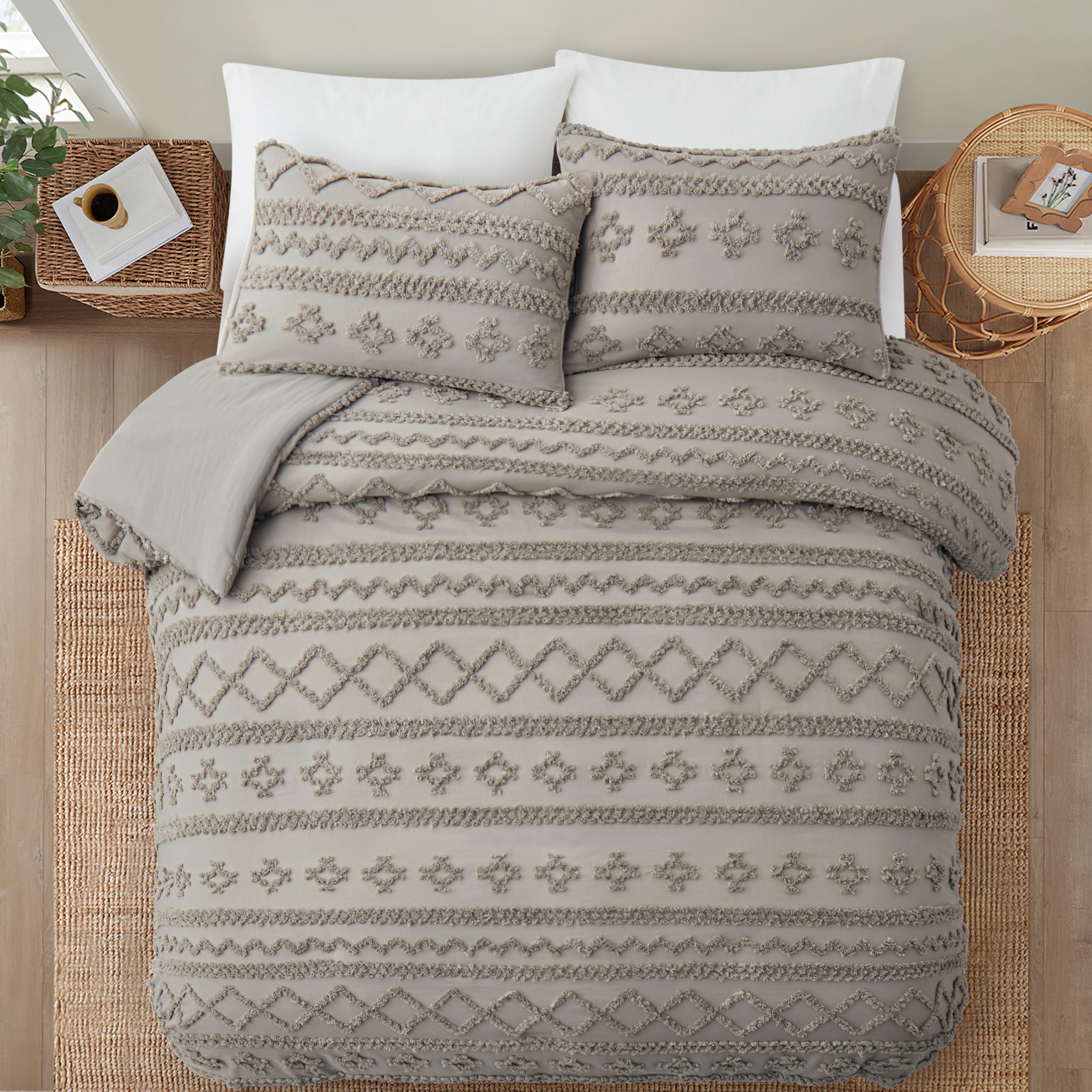 Oli Anderson, Queen Size Bettwäsche Set, Getuftet, 3 Teilig, Boho, Shabby Chic Stil, Tagesdecke Mit 2 Kissenbezügen (Hellgrau, Queen Size