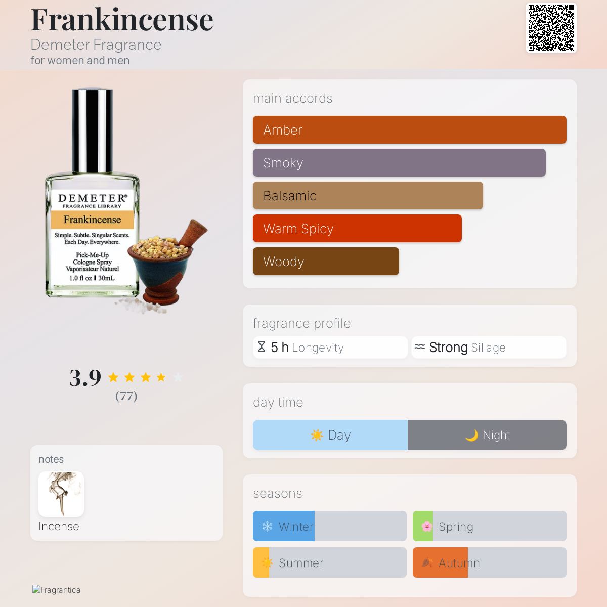 Frankincense Demeter Fragrance Parfum - ein es Parfum für Frauen Warnhinweise B018RAHA1G It is recommended for evening wear. Launched by the design house of Demeter in the year of 2015 Launched by the design house of Demeter in the year of 2015 This woody fragrance has a blend of incense, spicy, and woody notes It is recommended for evening wear Frankincense Essential Oil Demeter Frankincense Perfume 4 Oz Cologne Spray (Unisex Frankincense Oil Organic
