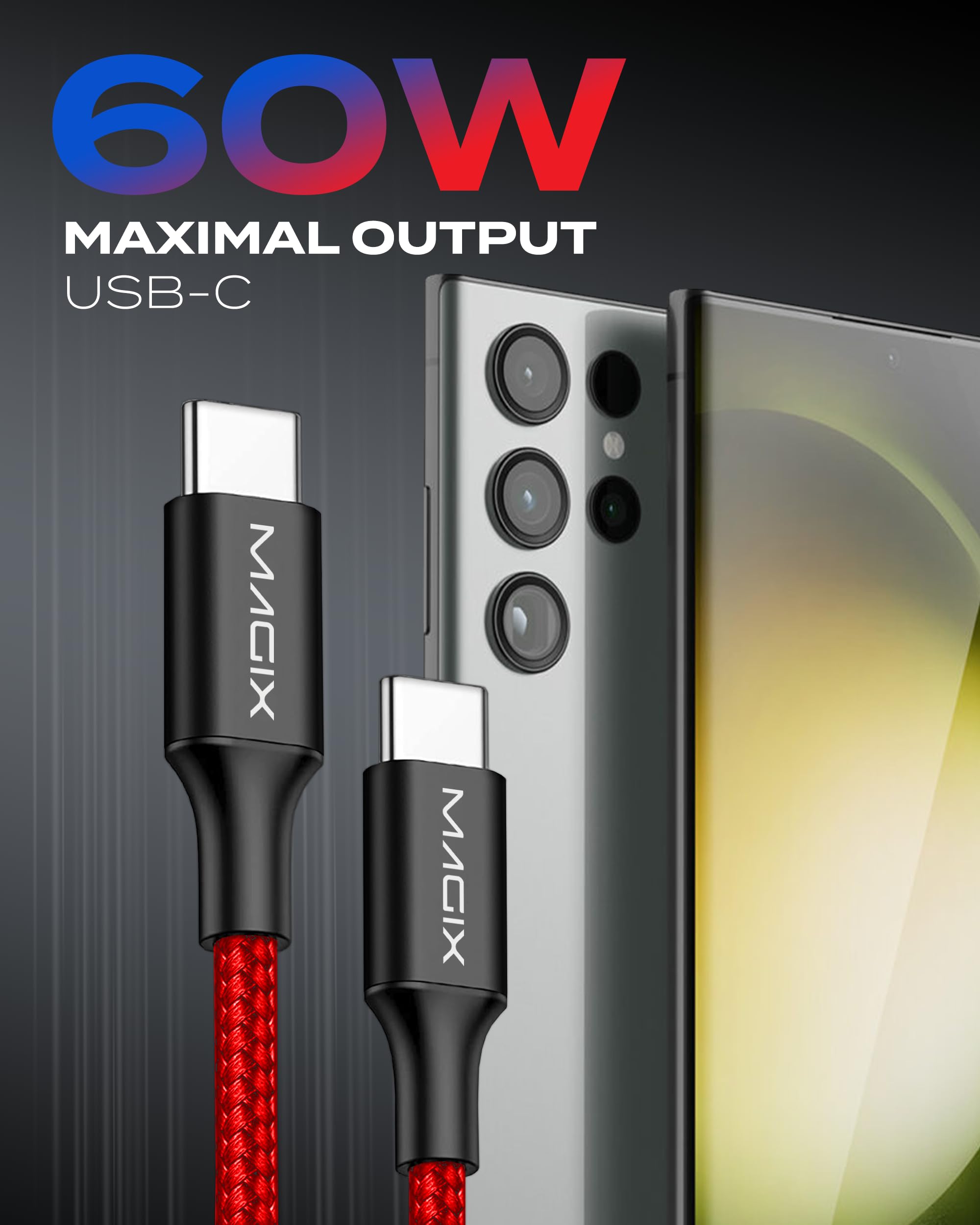 Magix USB-C-Kabel 60W 2m Rot, PD-Schnellladung 3.0 3 A, Datensynchronisationsgeschwindigkeit 480MB/s, KompatibelmitmacBook Pro/Air, IPad Pro 2021/Air 5, Galaxy S23/S22 Ultra, Pixel 7 6