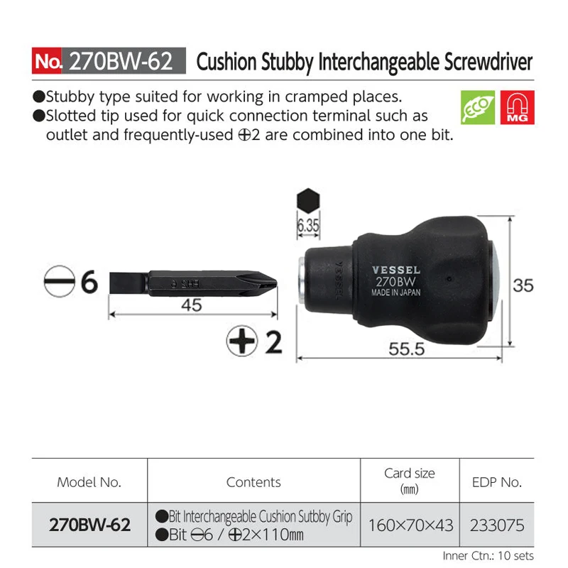 VESSEL entwickelt Produkte, um die Gesundheit und Sicherheit der Benutzer und ihrer Umgebung zu gewährleisten. Im Jahr 1933 begann das Unternehmen seine Produkte mit der Marke VESSEL, was ein großes Schiff auf Englisch bedeutet, als Zeichen für ihre überlegene Qualität zu prägen. Anwendungen: Elektroarbeiten, Montage von Möbeln, Wartung, Bordwand usw. Da die meisten Eisenhütten damals landwirtschaftliche Geräte wie Spaten und Hacken herstellten, stellte das junge Unternehmen ein Massenproduktionssystem ein, das auf die Herstellung von Schraubendrehern für industrielle Anwendungen spezialisiert war, und begann, seine Produkte auf den Markt zu bringen. Praktische kleine Griffe an engen Stellen (stumpfe Typ). Bit Gesamtlänge 45 mm Sechskant Achse: 6,35 mm Aufgesetzter Bit: Doppelkopf-Bit (+1 / + 3 (geteilt) / + 2 × volle Länge 45 mm) VESSEL CO., , INC. Material: Bit: Industrieller spezieller legierter Stahl (ganzer Körper abgeschreckt). In mehr als 100 Jahren Geschichte hat dieses felsenfeste Bekenntnis zur Qualität unsere Aktivitäten verankert. International products have separate terms, are sold from abroad and may differ from local products, including fit, age ratings, and language of product, labeling or instructions. Vessel Screwdriver Bessel (VESSEL) Pair PLUS (plus) ???? Driver NO.270BW-123 Vessel Schraubendreher ist ein führendes Unternehmen für Befestigungswerkzeuge.