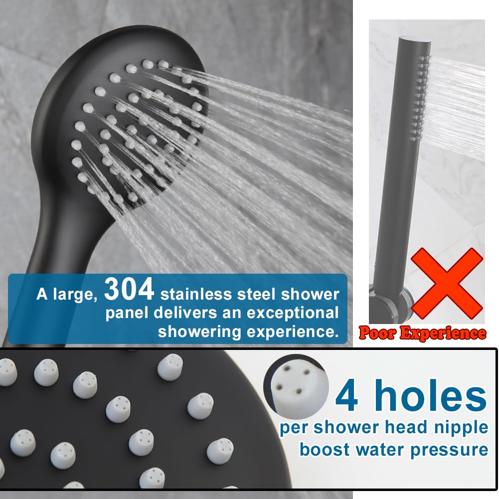 Die Handbrause sorgt für ein angenehmes Duscherlebnis. Flexibler Verlängerungsarm patentiertes Design: Die Länge von 33 cm vermeidet die Mühe, beim Duschen zu nah an der Wand zu sein. Zwei Knöpfe ermöglichen es Ihnen, jede Höhe und jeden Winkel zu wählen, den Sie benötigen. Leicht anzuziehen Verabschieden Sie sich von herabhängenden Duschen: Unsere neu gestaltete Halterung hält Ihre Handbrause sicher, kein Herunterfallen mehr nach Monaten des Gebrauchs. Hochdruck-Regendusche: Mit modernster Lufteinspritzungstechnologie mischt dieser Regenduschkopf Wasser mit Luft und verdoppelt den Druck für eine natürliche Regensimulation. In nur 2-5 Minuten genießen Sie ein luxuriöses Duscherlebnis. 【Ganzmetallkonstruktion】 Der Duschumsteller besteht aus massivem Messing. Die verstärkte Platte, mehr als verdoppelt in der Dicke, sorgt für Haltbarkeit unter erhöhtem Wasserdruck. Andere Teile wie Duschkopf, Handbrausekopf, Duscharm, Schlauch, Halterung, sind alle aus Edelstahl., Kein Kunststoff. 【Passt sich jedem Duschwunsch an】 Der clever gestaltete Verlängerungsarm lässt sich sowohl horizontal als auch vertikal einstellen und sorgt so für den perfekten Sprühwinkel für jeden in Ihrem Haushalt. Pop Sanitaryware Customer Service POP SANITARYWARE All Metal 10 Zoll Schwarz Duschkopf Mit Duschkopf Schwarz Mit Schlauch POP SANITARYWARE All Metal 10 Zoll Schwarz Duschkopf mit Handbrause Hochdruckbrause mit verstellbarem Verlängerungsarm, 4-Wege-Umsteller und 71 Zoll Schlauch, Mattschwarz 【Edelstahl Handheld】POP SANITARYWARE hat den Edelstahl Handbrause verbessert, es hat einen großen Duschbereich wie Kunststoff-Handbrauseköpfe, aber es ist stabiler und langlebiger, und bietet ein besseres Duscherlebnis als andere Marken von Edelstahl-Duschköpfen.