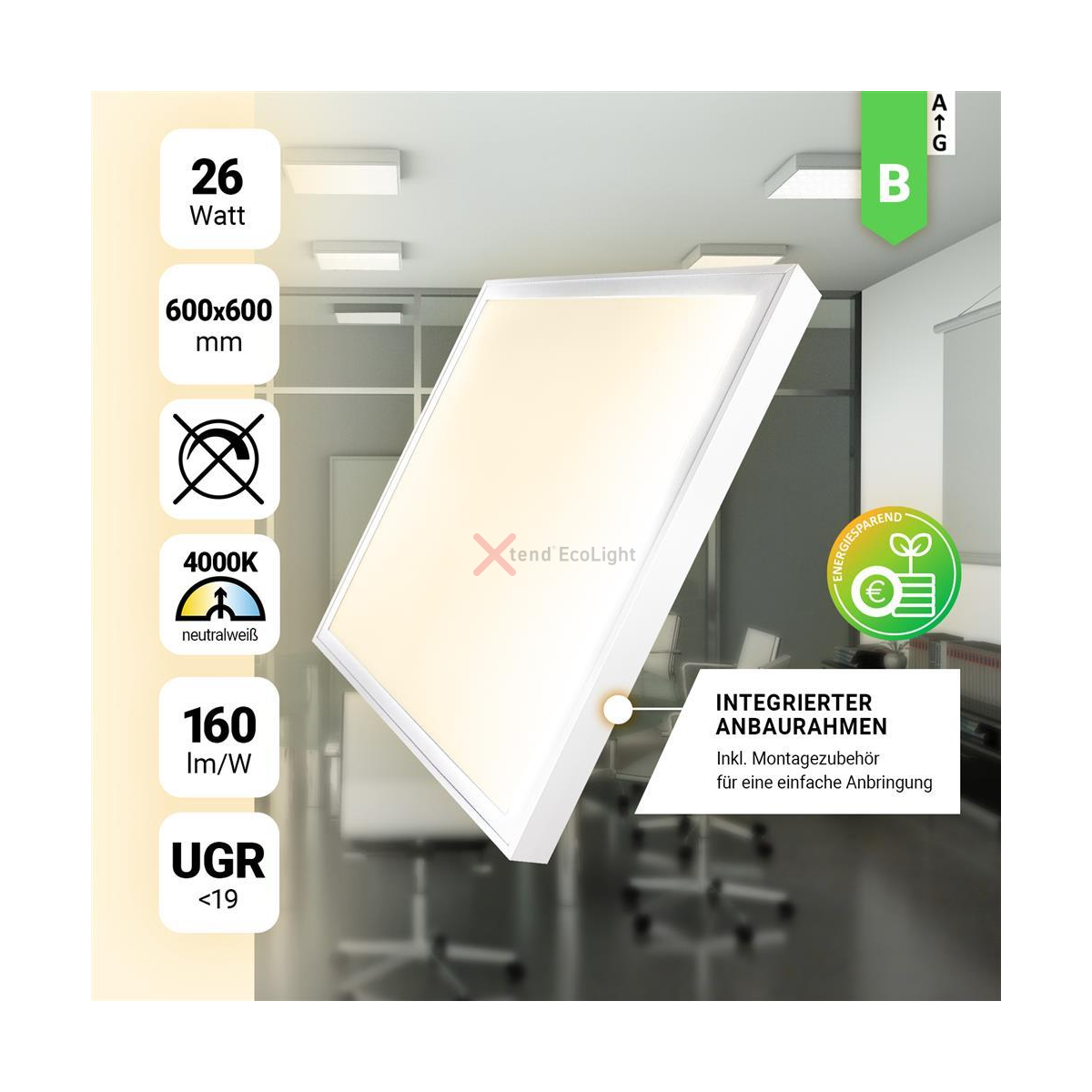 In den Meisten, auf den ersten Blick günstigen LED Panels, wird oft eine Lichtleiterplatte (LGP) aus PS Kunststoff verwendet. Hier ist unser 3in1 LED Panel inklusive dimmbarem Netzteil und Aufbaurahmen für die Aufputz Deckenmontage. LED Panel Deckenleuchte 60x60 Kaltweiß 6000K 40W mit Aufputz Der Zusammenbau des Montage Rahmens erfolgt schraubenlos durch einfaches Zusammenstecken Das LED Panel hat die Abmessungen 595x595x9mm, der Rahmen 600x600x50mm. Xtend EcoLight LED Panel 60x60 cm Tageslichtweiß 6000K 40W Aufbaurahmen Alu weiß Deckenleuchte flimmerfrei Netzteil Anbaupanel PLe2.2 {{ Vorgang.Artikel.Beschreibung.Kurzbeschreibung | SelectLanguage: Sprache }}. Diese Leuchte kann die drei Weißtöne Warmweiß (3000K), Neutralweiß (4000K) oder Tageslichtweiß (6000K). Led Panel 62x62 6x Tageslichtweiß 6000K 40W PLe2.2, 179,99 Xtend Ecolight Im Zentrum ist das LED Panel dann oft auch deutlich dunkler als am Rand. PMMA (Polymethylmethacrylat) ist ein transparenter thermoplastischer Kunststoff. Im nur 5 cm hohen und weißen Rahmen ist Platz für das LED Panel und das Netzteil. Diese Leuchte enthält eine Lichtquelle der Energieeffizienzklasse E mit einem externen Betriebsgerät. Sie können die Lichtfarbe vor der Montage über einen im Kabel integrierten Schalter auswählen. Das Material vergilbt unter UV-Licht. LED Panel 60x60 3CCT 3000K-4000K-6000K 40W dimmbar 0-10V Deckenleuchte PLs3.0. Dimmbar 0-10V. Lichtfarbe und Helligkeit stufenlos per Fernbedienung regelbar. Die Abkürzung CCT steht für Correlated Color Temperature, auf Deutsch korrelierte Farbtemperatur 3in1: Das LED Panel beherrscht die 3 Weißtöne Warmweiß (3000K), Neutralweiß (4000K) und Tageslichtweiß (6000K). Mithilfe des im Lieferumfang enthaltenen weißen Aufbaurahmen können Sie das Panel bequem Aufputz an der Decke befestigen. Der Rahmen muss nicht umständlich zusammengeschraubt werden, sondern wird einfach zusammengesteckt.