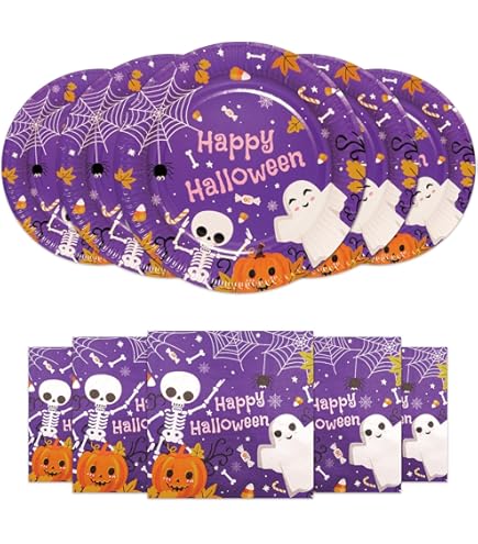 Pappteller Halloween Servietten Dessertteller Set 48 Stück Niedliche Gespenste Partygeschirr Set Deko, Lila