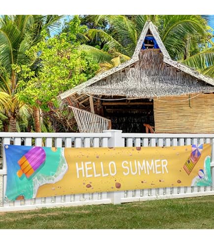Großes Hello Summer Banner für Zaun, Sommer-Party, Dekoration Große Größe: Mit den Maßen 300 x 50 cm ist dieses Hallo Sommerbanner groß genug, um bei Ihrem besonderen Anlass ein Statement zu setzen 【Paket beinhaltet】 Dieses Hallo Sommerbanner Set enthält einen Strandhintergrund und ein 6 m langes Bandseil. Das Design verfügt über einen bunten Hello Summer-Schriftzug zusammen mit lebendigen Sommerelementen wie Kokosnüssen, Muscheln, Hibiskusblüten und Wellen, die für eine lustige Sommeratmosphäre sorgen. 【Breite Anwendung】Perfekt für Sommerpartys, Strandversammlungen, tropische Themenveranstaltungen und andere festliche Anlässe, dieses Hallo Sommer Strand Banner kann als Partydekoration oder eine lustige Fotohintergrund verwendet werden, was es zu einem großen Hit bei Sommer- und Strandpartys macht. Es ist reißfest, leicht zu falten und wiederverwendbar, was es zu einer dauerhaften Ergänzung für Ihre Sommerfeiern macht. Lade diesen kostenlosen Vektor von Tropischer Strandhintergrund mit den ein Sonnenbad nehmenden Leuten herunter und entdecke Millionen von professionellen Vektoren auf Freepik. Schöner tropischer Strandhintergrund | Kostenlose Vektor 【Premium-Material】Hergestellt aus Polyester, ist diese Sommerpartydekoration leicht, langlebig und in kaltem Wasser waschbar. Aloha Deko Starlit Patio Tiki Bar Banner Hawaii Luau Party Dekorationen Hawaii Deko Outdoor