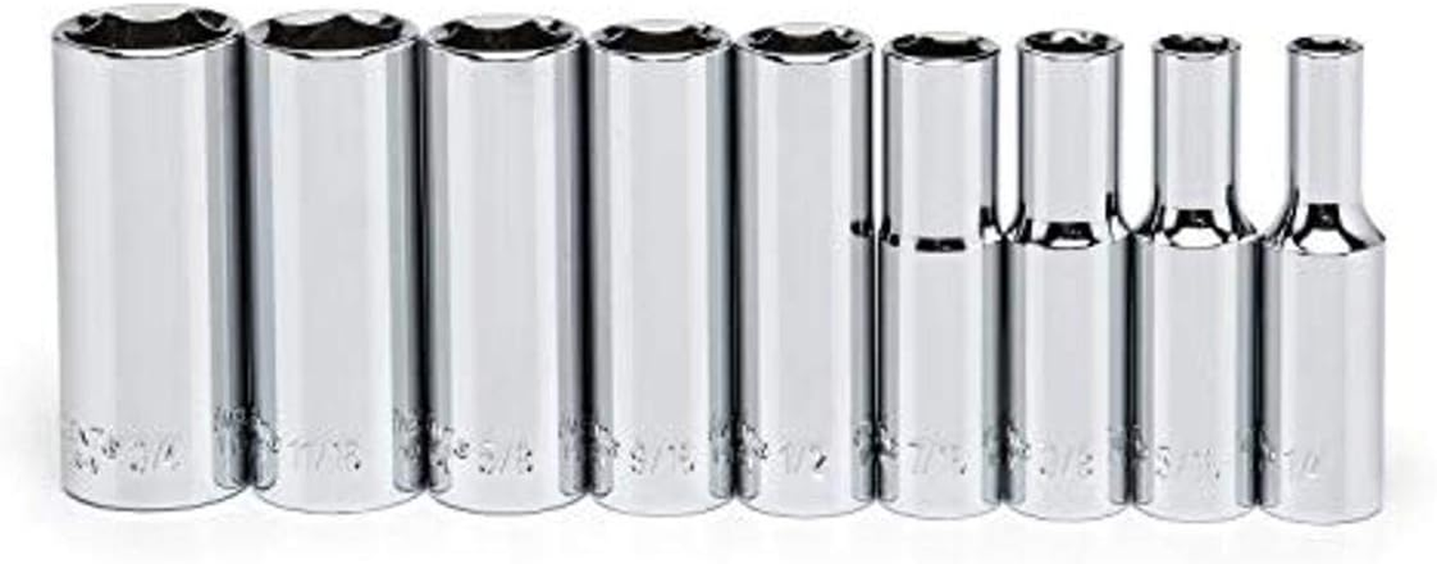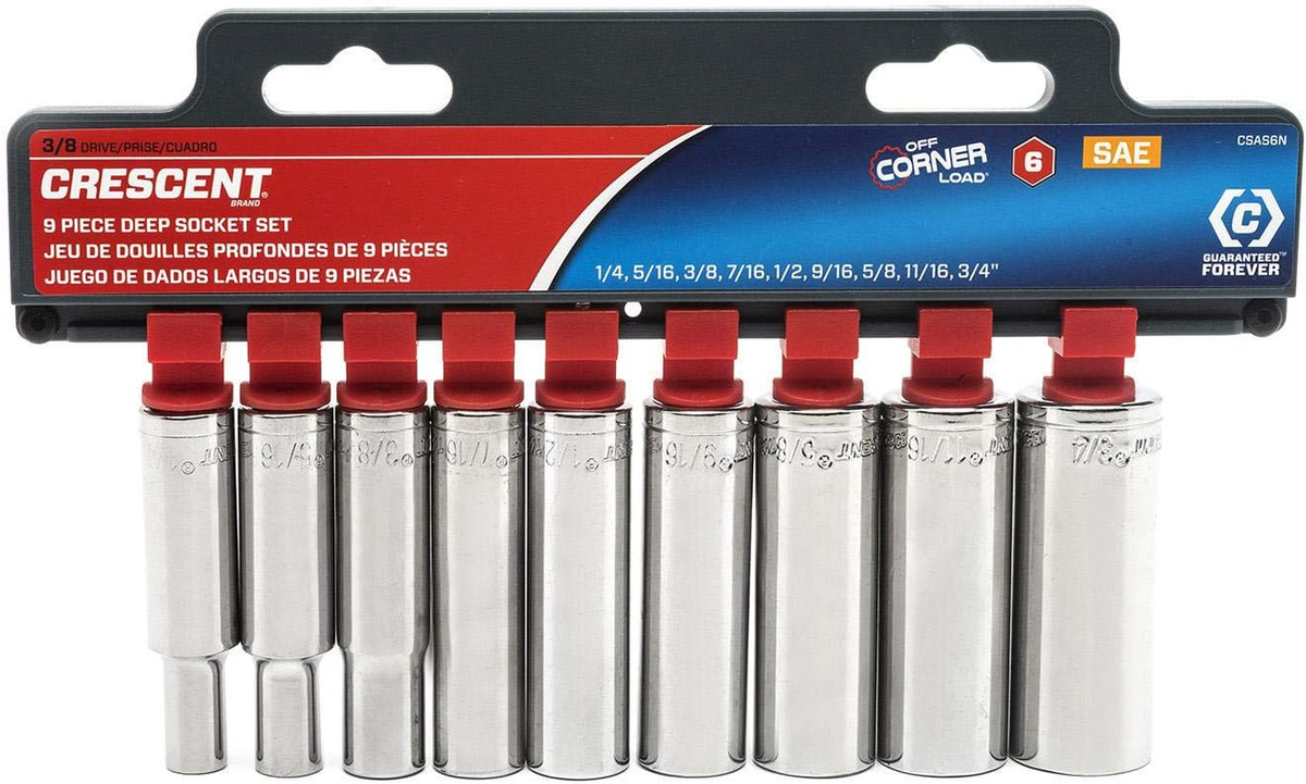 Sockets feature off corner loading technology to virtually eliminate fastener rounding I load specifications, resulting in tools you can count on to be strong, well-designed, and durable enough to get the job done right, time after time. Trusted by the trades. Mirror polish finish that’s easy to Wipe clean Tools meet stringent new ANSI and ASME specifications and come with a full Satisfaction guarantee Made of chrome vanadium steel alloy specially formulated and heat-treated for strength and corrosion-resistance Crescent 9 Pc. 3/8" Drive 6 Point Deep SAE Socket Set - CSAS6N