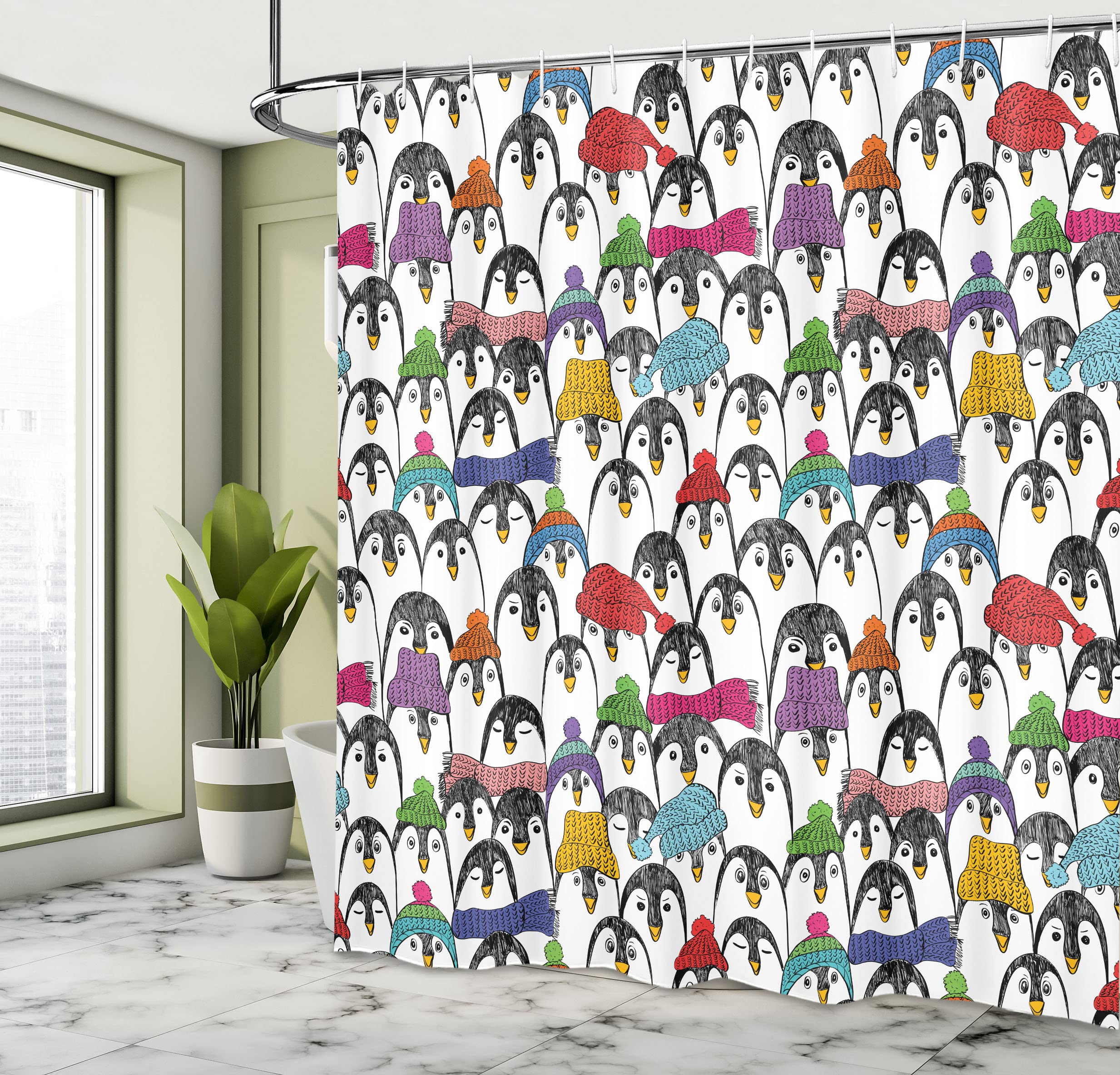WUASDCS Cartoon Pinguin Duschvorhang Niedlich Lustige Tier Pinguine Wildlife Streifen Jungen Mädchen Badezimmer Dekor Stoff Vorhänge Mit Haken
