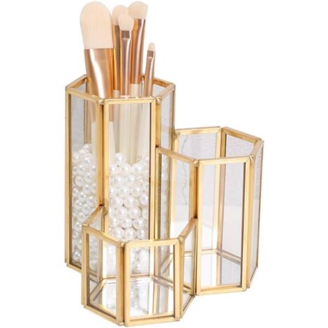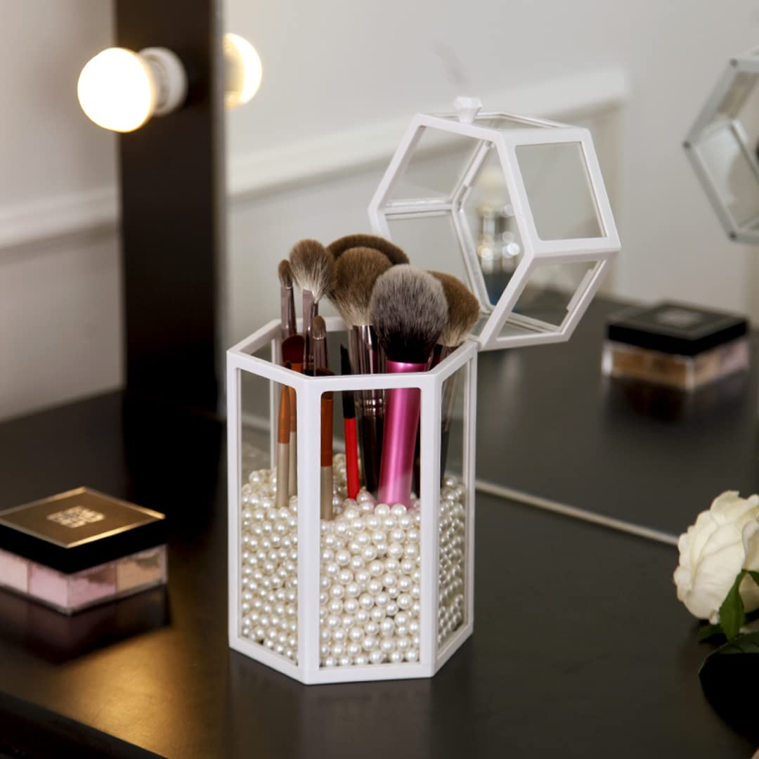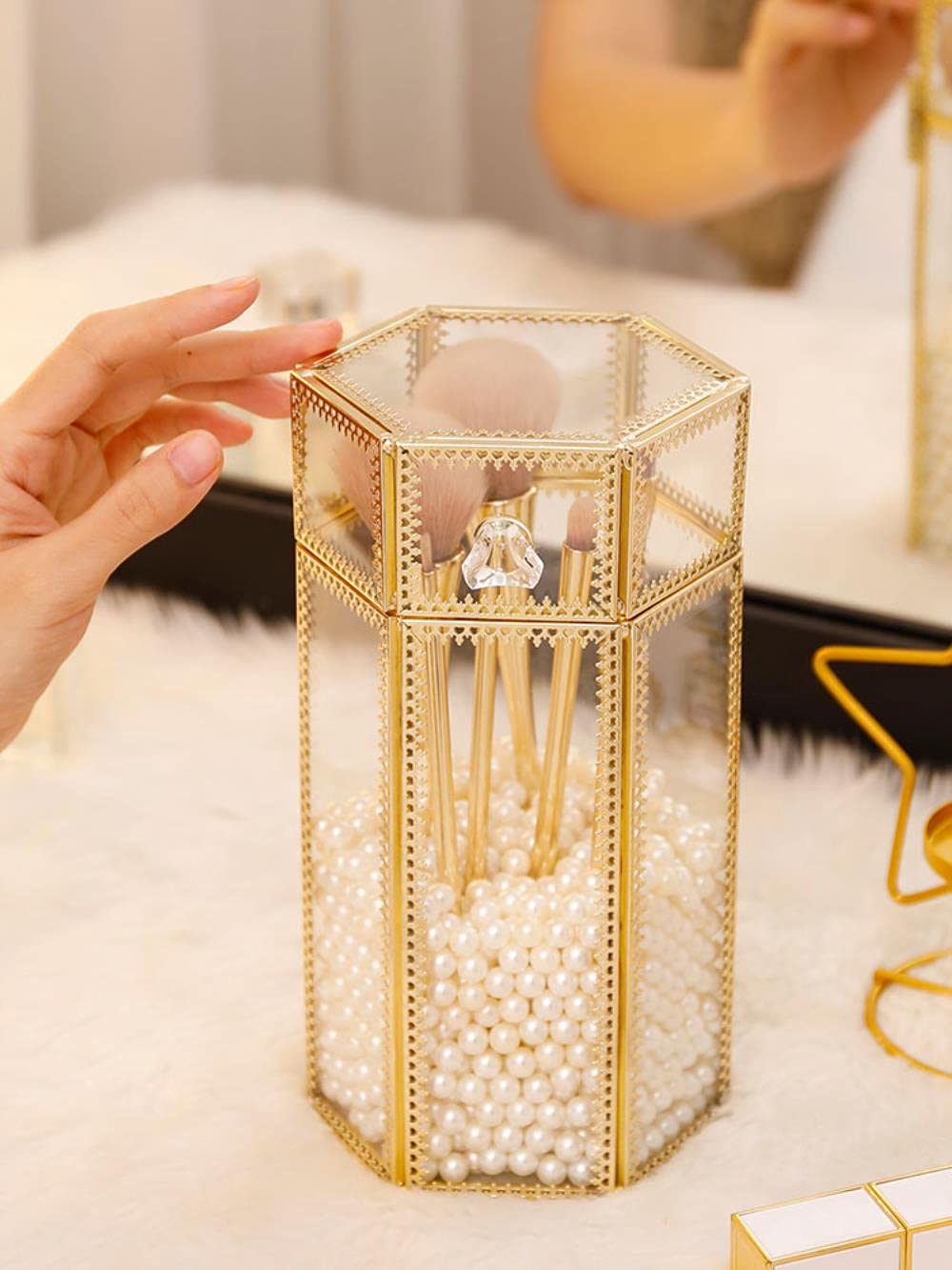 Make Up Pinsel Organizer Make-up-Pinselhalter Aus Glas Mit Perlen, Kunststoffeinfassung, Make-up- Pinsel-Organizer, Transparente Kosmetikpinsel-Aufbewahrungsbox, Staubdicht, Sechseckig, Schwarz Pinsel Aufbewahrung Dieser Kosmetikpinsel-Aufbewahrungseimer hat einen niedrigen Schwerpunkt und steht sehr stabil auf dem Tisch. - Ein einfaches, aber praktisches Geschenk für Freunde zu Weihnachten, Geburtstag, Einweihung usw Dieser Halter hat zwei Stile, vierseitig und sechseckig, jeder Stil ist sehr schön und fein verarbeitet, kann Ihre Speicherbedürfnisse erfüllen. 【Premium Material】Der Bürstenhalter besteht aus strapazierfähigem Glas und Kunststoffmaterial, das genug ist, um Ihre verschiedenen Größen von Pinseln aufzubewahren. Dieser aus feinem Eisen und Glas gefertigte Organizer ist nicht nur praktisch, sondern auch ein echter Blickfang. Er bietet eine stilvolle Aufbewahrung für Ihre Beauty-Utensilien und hält Ihre Make-Up Pinsel ordentlich und stets zur Hand ARTSEWPLY Transparenter Glas Make Up Pinselhalter mit Perlen Und das Kunststoffkanten-Design kann effektiv verhindern, dass Ihre Gegenstände zerkratzt werden. Kostenlose Perlen: Es gibt viele funkelnde weiße künstliche Perlen kostenlos, diese Perlen können die Pinsel perfekt halten und den Pinselhalter schöner machen.