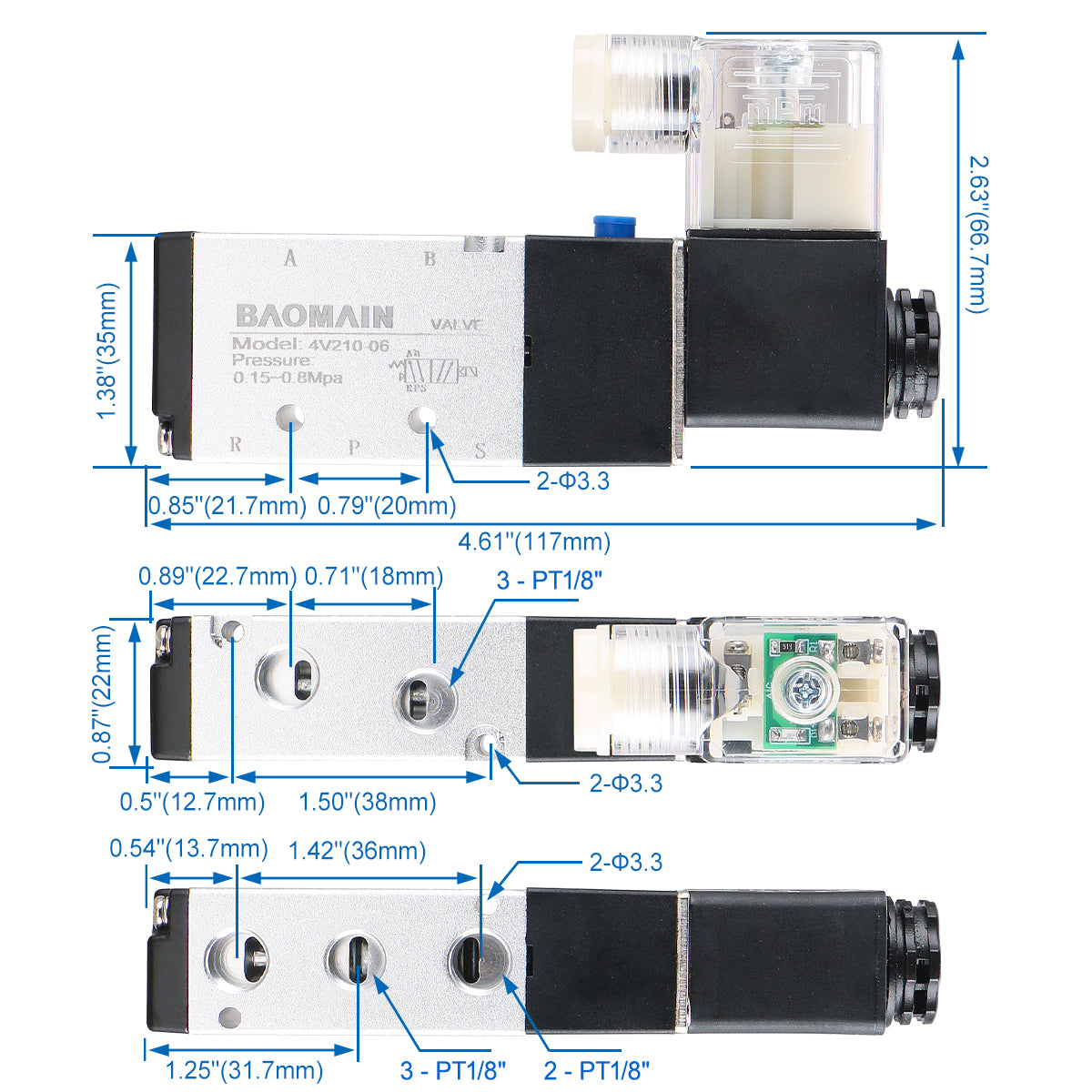 Heschen Elektro-Pneumatische Magnetventil 4V210-08 24VDC 4.8W PT1/4 5 AirTAC 4V210-08-CG - 5/2-Wege-Magnetventil Federrückstellend - G Bestehend aus 5 Magnetventilen und Basis, eingebauten Schnellarmaturen und Magnetventil-Schalldämpfern. Es wird weit verbreitet auf pneumatischen Systemen und Mechanismen, wie Textilindustrie, Leichtindustrie und chemische Industrie usw. 2 Magnetventile sind auf einem Sockel verbunden, 2 Positionen, 5-Wege- und Einzelkopf-Design. Bestehend aus 5 Magnetventilen und Basis, eingebauten Schnellarmaturen und Magnetventil-Schalldämpfern Gesamtgröße (L x B x H): 174 x 116 x 90 mm Spannung: 110 V Wechselstrom; Position und Weg: 2 Positionen, 5 Wege Schnell montierbarer Innendurchmesser: Magnetventil: 6 mm; Sockel: 8 mm