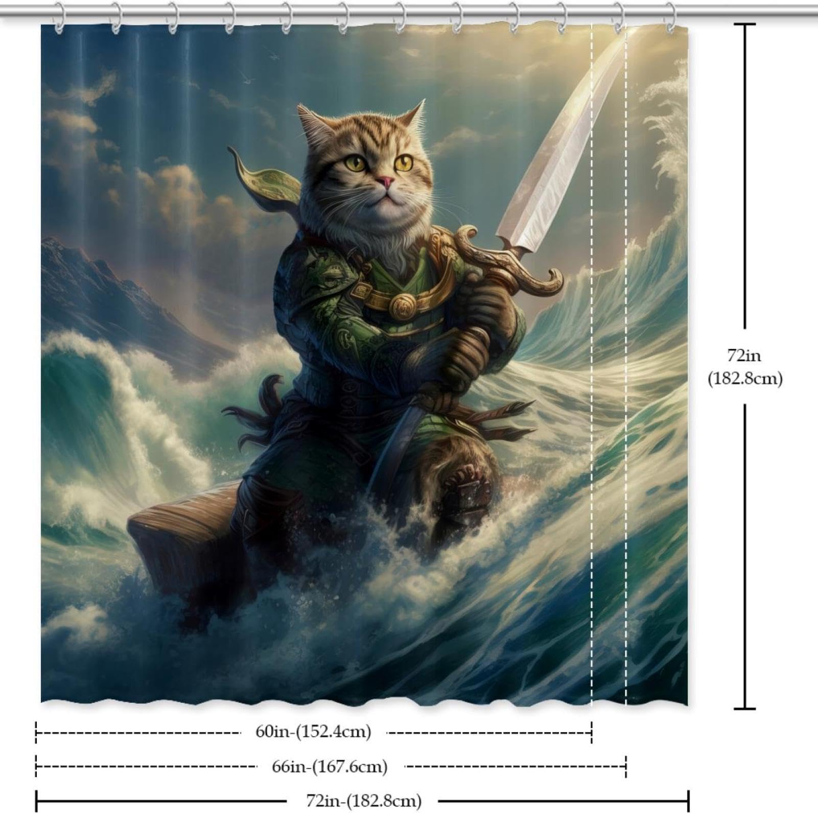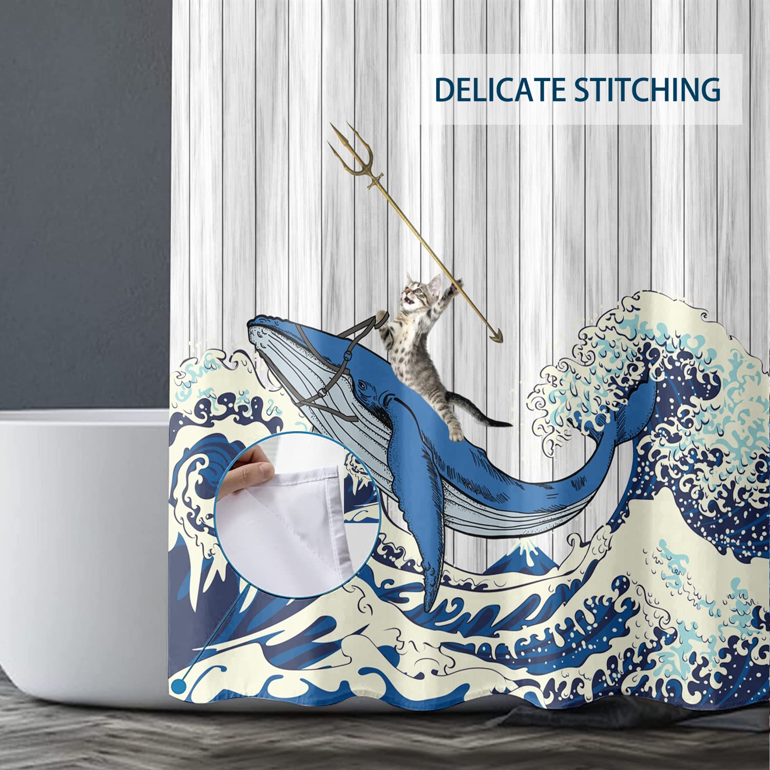 Stoff-Duschvorhang, Wasserdichtes Design, Polyester, Schnell Trocknend, Duschvorhänge-Set Für Badezimmer,Japanische Cartoon-Tierkatze Und Meereswellen-Retro