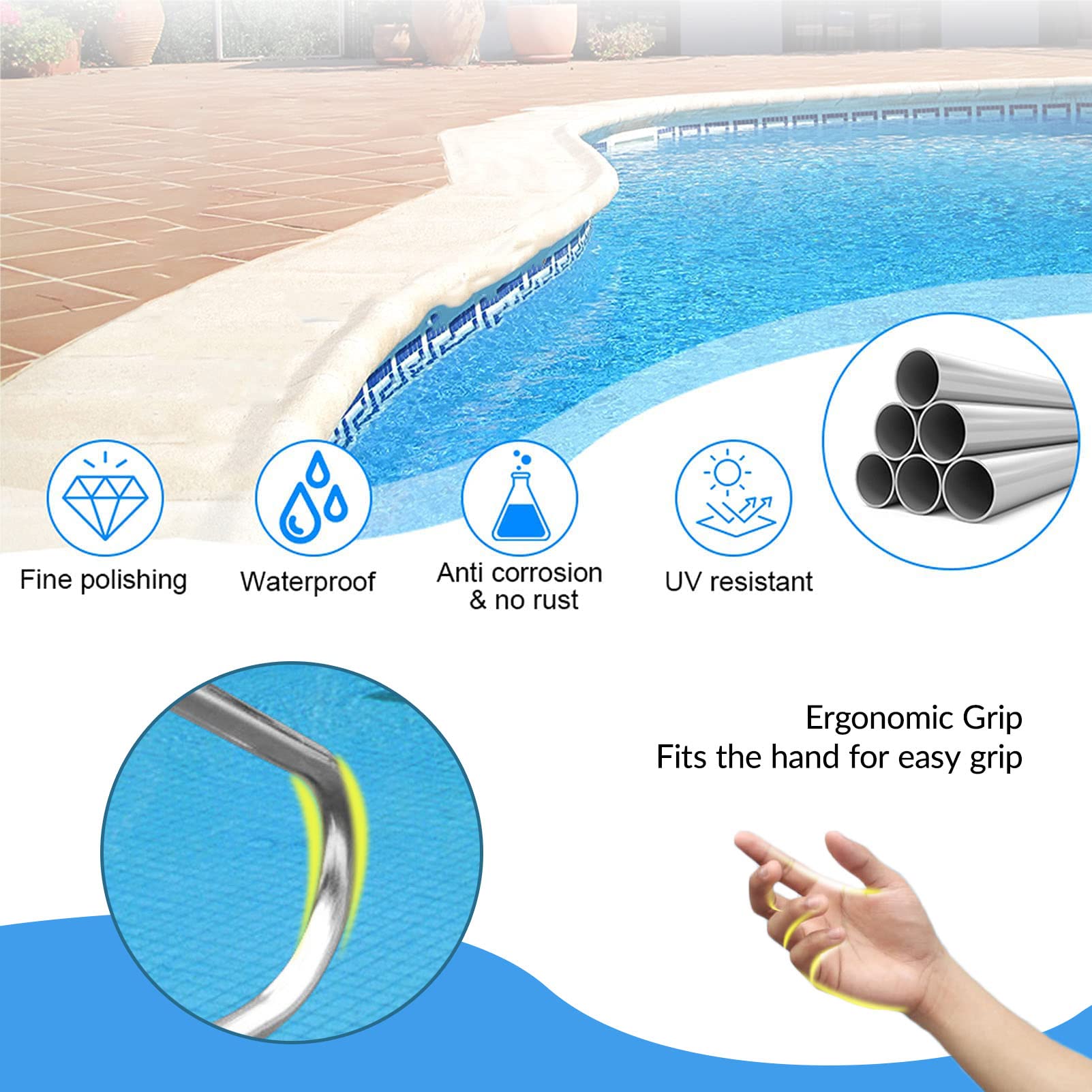 Es kann leicht auf Beton-, Holz- oder Ziegelböden installiert werden. Dieser Pool-Handlauf ist sowohl für den Innen- als auch für den Außenbereich in Wohn- und Gewerbeflächen geeignet. Bei heißen Sommertemperaturen ist Vorsicht geboten, da Poolhandläufe unangenehm heiß werden können. Edelstahl Handlauf Konfigurator – individuell nach Maß Verleihen Sie Treppen, Balkonen oder Eingangsbereichen einen sicheren und stilvollen Akzent – mit den individuell konfigurierbaren TIBU Edelstahl-Handläufen & Geländern Pool Handlaufpaket Premium aus Aluminium für Ovalbecken Das Edelstahlrohr hat einen Durchmesser von Φ1,5 Zoll (3,8 cm), bietet eine stabile Unterstützung. Die starke Schweißung zwischen dem Handlaufkörper und seinen Komponenten gewährleistet eine Tragfähigkeit von bis zu 330 Pfund (150 kg). Es ist kompatibel mit verschiedenen Umgebungen, einschließlich Pools, schrägen Eingangspools, Spas und Wasserparks. Die Montage kann von einer Person in nur wenigen Minuten abgeschlossen werden, mit vorgebohrten Löchern und mitgelieferten Schrauben und Dübeln für eine sichere Befestigung. Dieser Pool-Handlauf hat eine Länge von 80 cm und eine Höhe von 47 cm, wodurch er für die meisten Pools geeignet ist. Um Verbrennungen zu vermeiden, sollten Sie den Handlauf vor Gebrauch mit einem feuchten Tuch abwischen oder längere direkte Sonneneinstrahlung vermeiden. Pool Handlauf Pool-Handlauf, 304 Edelstahl, Schwimmtreppengeländer Für Den Pooltreppe 150cm Poolhöhe