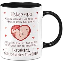 Tassenbrennerei Tasse - Liebe Oma herzlichen Glückwunsch, denn Du wirst Oma - Geschenk für werdende Großmutter - Schwangerschaft verkünden (Blau) von Tassenbrennerei. Geschirr günstig online kaufen bei Möbel & Garten Mögliche Suchbegriffe, die zu diesem Produkt führen könnten: Werde Opa Tasse, Schwangerschaftsverkündung für Großväter, Geschenk für Bald-Großvater, Ankündigung der Großelterneigenschaft, Überraschung für werdenden Opa, Nachricht der Geburt für Opa, Besondere Geschenkideen für zukünftige Großväter, Großvaterankündigung und vieles mehr! Immer ein schönes kleines Geschenk, Mitbringsel und die perfekte Bürotasse. Hochwertige Keramik Motto-Kaffeetasse in Komfortgröße: Kaffeebecher ca. Postkarte Du wirst Oma - Him & I Spülmaschinen- und mikrowellengeeignet Beidseitig bedruckt & Spülmaschinenfest: Wir geben zwei Jahre Garantie auf den Tassendruck unserer lustigen Mama loading Statement Tee & Kaffee Tassen mit Spruch. Tasse mit Spruch: Lieber Opa - herzlichen Glückwunsch, denn Du wirst Großvater! Eine wunderschön gestaltete Tasse, die in einer herzlichen Botschaft verkündet, dass bald ein neues Familienmitglied hinzukommt Kaffeepott als kleine Geschenkideen: Persönliche und originelle Geschenke an Weihnachten für werdende Großeltern, Oma als Weihnachtsgeschenk oder zum Nikolaus als Nikolausgeschenk., Du wirst Oma. Herzlichst, Dein baldiges Enkelkind. 22Feels Tasse Du Wirst Oma Schwangerschaft Geschenk Baby Werdende Grossmutter Frauen Keramik Made In Germany Spuelmaschinenfest S0ta204n Das liebevoll gewählte Design spiegelt die tiefe Freude und Erwartung dieses besonderen Moments wider. Häferl Durchmesser: 80mm, Höhe: 96mm mit einem von Fassungsvermögen 330ml Der perfekte Kaffeehaferl für jeden Morgenmuffel. Unsere witzigen Sprüche Haferl machen Morgen für Morgen Spaß, Freude und lassen den Kaffee gleich besser schmecken. Motiv, Grafik, Sprüche beidseitig bedruckt. Eine wunderschön gestaltete Tasse, die in einer herzlichen Botschaft verkündet, dass bald ein neues Familienmitglied hinzukommt. Obwohl ich noch in Mamas Bauch bin, möchte ich Dir schon jetzt sagen, wie sehr ich mich darauf freue, Dich kennenzulernen. 330ml Fassungsvermögen Spülmaschinengeeignet mit garantierten 3000 Spülgängen 2 Jahre Garantie auf unseren Druck Mikrowellenfest Hohe Langlebigkeit und Farbbrillanz Beidseitig bedruckt In Deutschland mit Liebe designed und in Handarbeit bedruckt Durchmesser: 80mm, Höhe: 96mm Ideal als: Überraschungsgeschenk für baldige Großväter Gefühlvolles Präsent zur Schwangerschaftsankündigung in der Familie Unser Teetasse ist langlebig und vor allem FREI von Schadstoffen. Frauen Sprüchetassen mit und ohne Sarkasmus als Gadgets: Unsere lustigen Kaffeebecher & Teetassen sind nicht nur Spassgeschenke schmücken jeden Schreibtisch im Büro und dienen hervorragend zur Aufmunterung.