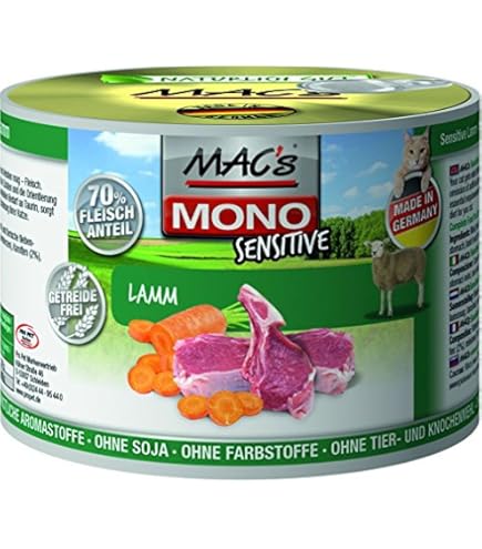 getreidefreie Rezeptur;hoher Fleischanteil , Made in Germany MAC's Mono Sensitive ist ein besonders gut verträgliches Nassfutter, das für die Ernährung ausgewachsener Hunde mit Neigung zu Futtermittelallergien entwickelt wurde. Das schmackhafte Futter wird mit viel Fleisch nur einer Sorte hergestellt Produktbeschreibung Mac's Dog Sensitive Pute besteht ausschließlich aus Pute in Kombination mit Süßkartoffel und ist daher besonders gut für empfindliche oder allergische Hunde geeignet. MAC's Katzenfutter günstig online kaufen bei Die besondere Rezeptur ist getreidefrei und ein besonderes Geschmackserlebnis für Ihren Liebling. ohne natürliche und künstliche Aromastoffe;ohne Farbstoffe;ohne Tier- und Knochenmehl; Gran Carno MAC's - Dog - Mono Sensitive Pute | 6 X 800 G | 6 X 800 G | Pute | 1hnu72 Grancarno 800g Dosen ohne Zuckerzusatz;ohne Salzzusatz;ohne Tierversuche MAC's Cat Mono Sensitive frische Pute