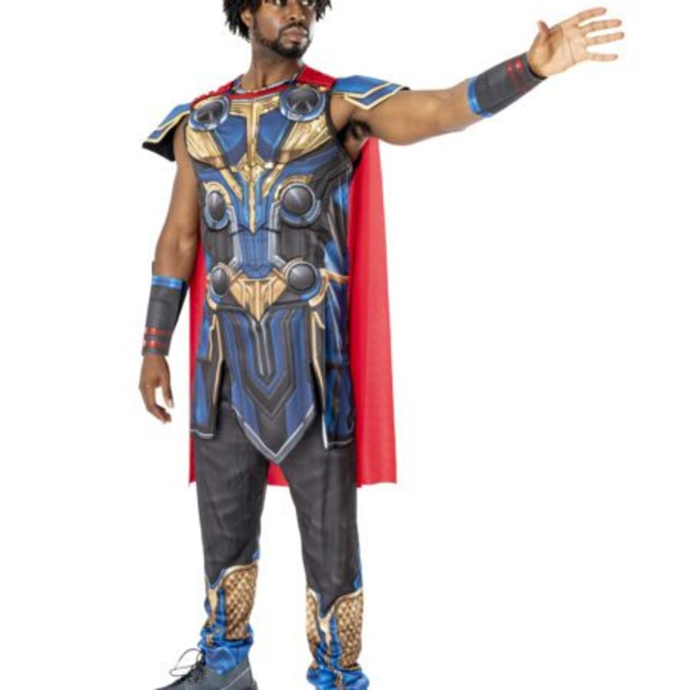 Deluxe Thor-Kostüm – Kleidung des asgardischen Kriegers Ein roter Umhang mit Klettverschlüssen an den Schultern, ein Paar bedruckte Schaumstoffmanschetten. Eine bedruckte bedruckte Tunika mit Schulterpolstern, eine bedruckte Hose aus Jersey Ein Paar bedruckte Schaumstoffmanschetten. Thor™ TLT luxe Kostüm für Herren | Costumalia by Mister Kostüm Thor Love And Thunder GOD OF WAR: RAGNAROK - Deluxe Thor Mjolnir (Full Metal Thor Costume