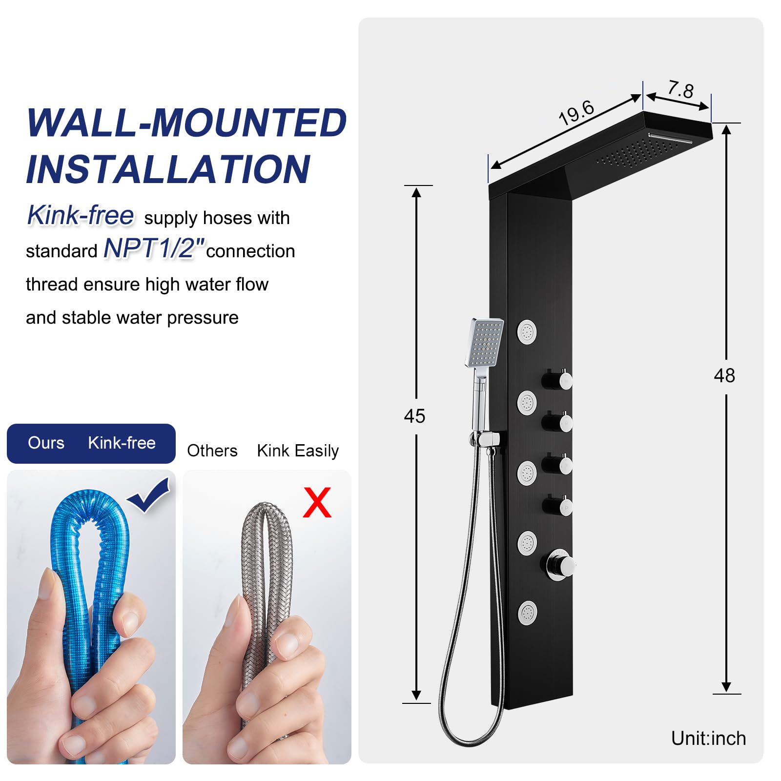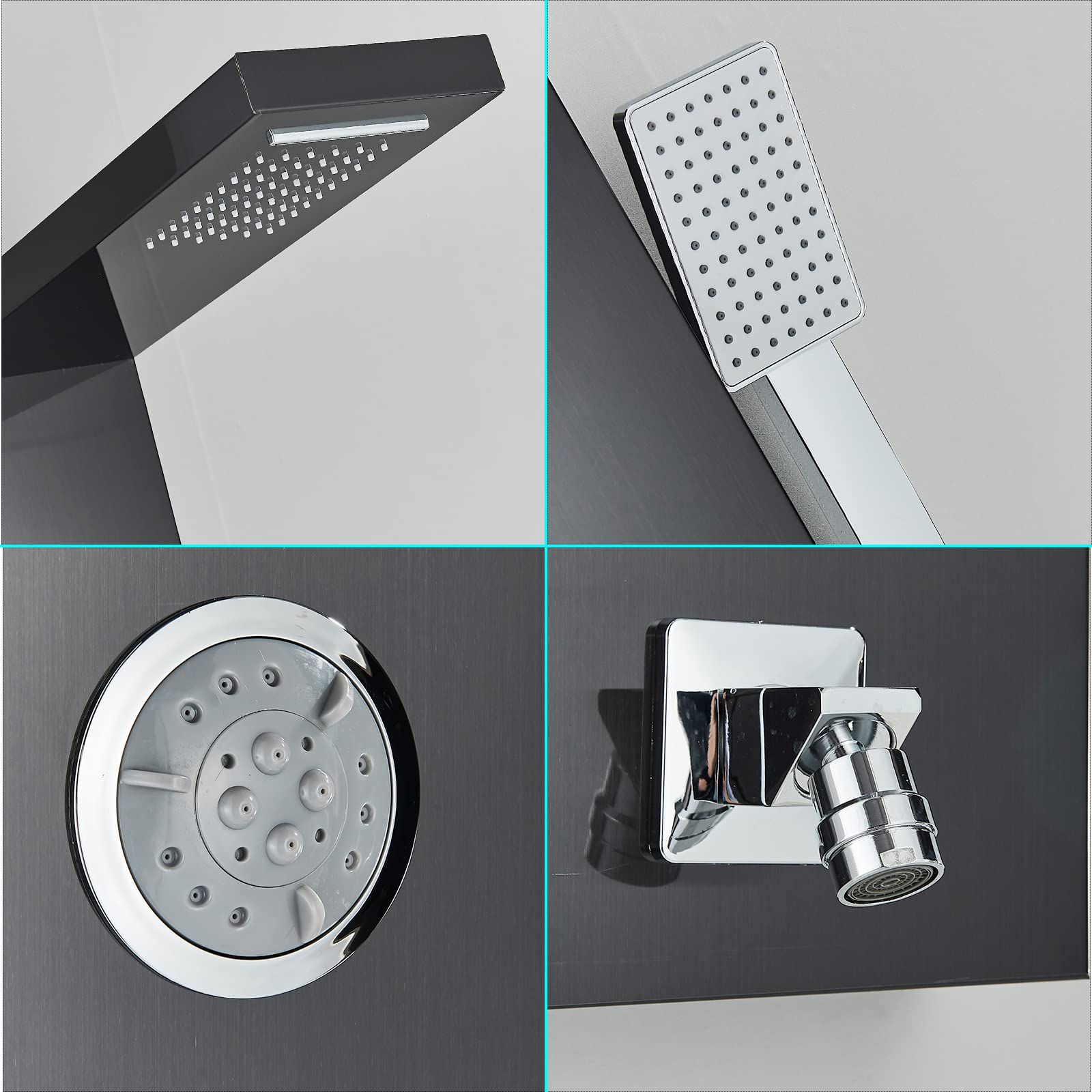 Drehen Sie die 4 Duschknöpfe gegen den Uhrzeigersinn, um die Dusche einzuschalten, im Uhrzeigersinn schaltet die Duschen aus; 4-Modi können separat oder gleichzeitig laufen; Drehen Sie den unteren Knopf, um die Wassertemperatur und -volumen zu steuern 【Duschturm-Systemmaterial】Das Duschpaneel ist aus präzisem, hochwertigem 304 Edelstahl gefertigt, um langlebig und korrosionsbeständig zu sein, Messing-Mischventil und Duschumstellventil im Lieferumfang enthalten. Der Wasserfall-Duschkopf erzeugt einen weichen Wasserfluss, Sie können die Schönheit des natürlichen Wasserfalls zu Hause spüren. Schaffen Sie einen neuen Look für Ihr Badezimmer, genießen Sie Spa zu Hause 【Ranifall und Wasserfall-Duschkopf】 Regenduschkopf: deckt Ihren gesamten Körper ab, ohne sich umdrehen zu müssen, bietet eine tränkende, regenähnliche, völlig entspannende Erfahrung. Bei Fragen zum Produkt, zögern Sie nicht, uns zu kontaktieren, wir werden Ihnen innerhalb von 12 Stunden antworten und Ihnen die zufriedenstellendste Antwort geben Mit Regen- und Wasserfall-Überkopfbrause, Handbrause und 5 Körpermassagedüsen bietet das Duschpaneel ein unvergessliches Duscherlebnis zum Entspannen und Wohlfühlen. Rüsten Sie Ihr Badezimmer mit dem -Duschpaneelsystem auf, das über 6 Duschmodi, LED-Leuchten, verstopfungssichere Düsen und eine langlebige Edelstahlkonstruktion verfügt ROVATE Duschpaneel Turmsystem 304 Edelstahl, Duschpaneelsystem Mit Verstellbarem Regenduschkopf, 6 Körpermassagedüsen Und 5 Funktionen Handheld, Gebürstete Oberfläche Erfüllen Sie Ihre Duschbedürfnisse, wählen Sie die Art und Weise, die Sie lieben Rüsten Sie Ihr Badezimmer mit dem VEVOR-Duschpaneelsystem auf, das über 6 Duschmodi, LED-Leuchten, verstopfungssichere Düsen und eine langlebige Edelstahlkonstruktion verfügt. Duschsystem, Regendusche und Wasserfall mit Wandmontage, eingebauter Wasserhahn mit Thermostat, Schwarz, Gitano Termine und Hausbesuche nach telefonischer Anmeldung