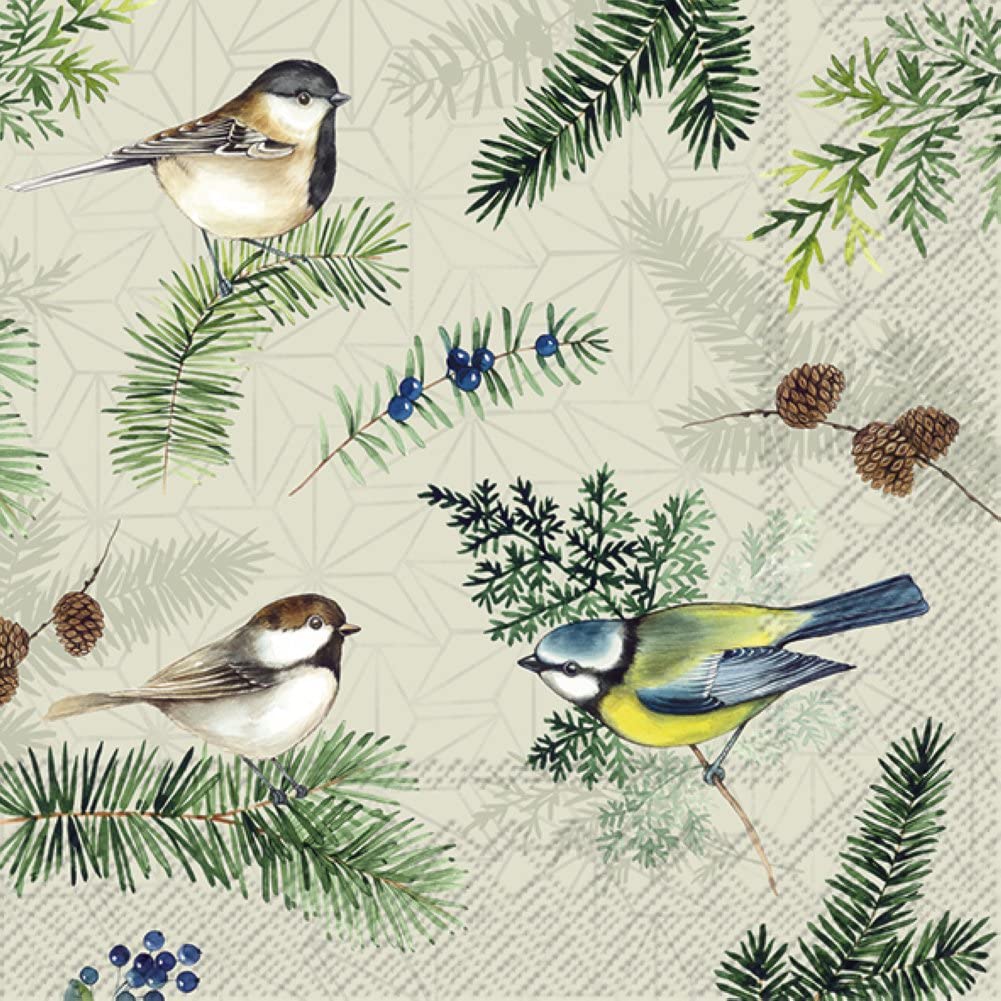 IHR Ideal Home Range - Weihnachtsservietten WOODLAND BIRDS Meise Vogel Laub Blätter Winterlich Nature 20 St. Cocktail-Servietten 25 Cm X 25 Cm