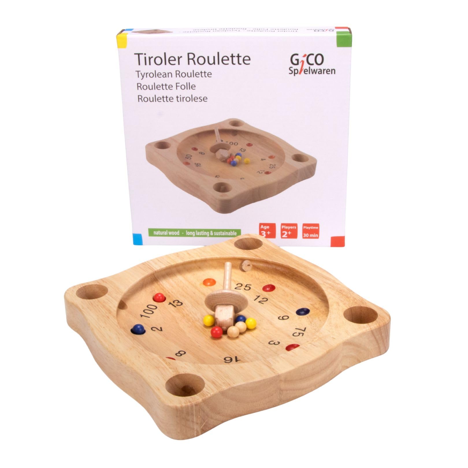 Alternativ können Sie auch eine Rundenanzahl festlegen und zählen am Ende die erreichten Punkte zusammen, um den Gewinner zu ermitteln. Holzspiel aus natürlichen Samanea Holz aus Plantagen mit nachhaltigem Neuanbau Danach drehen die Spieler abwechselnd im Uhrzeigersinn den Kreisel, der die Kugeln in die verschiedenen Löcher drängt. Beim Tiroler Roulette ist das Ziel, durch Drehen des Kreisels auf der Spielscheibe eine möglichst hohe Punktzahl zu erreichen und so das Spiel zu gewinnen. Rote Kugeln rechnen sich als Minuspunkte. Diese sind vor allem nach der Spielanleitung von Bedeutung. Samanea Holzboard in der Größe 19,5 x 19,5 x 3,5 cm mit Kugeln aus Holz ab 7 Jahren · für 2 bis 6 Spieler/innen · Spieldauer beliebig · mit 10 Kugeln · Durchmesser des Roulettes außen: 22 cm · Material: Gummibaumholz Roulette Spiel Casino Set Hochwertig Knobelholz Tiroler Roulette Kreiselspiel Twister Roulette Für 2 Bis 8 Oder Mehr Personen Spielanleitung Noris Tiroler Roulette besteht aus einer Spielscheibe, einem Kreisel und 6 Kugeln, wobei je eine blaue Kugel und eine rote vorhanden sind. Tiroler Roulette ist ein Glücksspiel, für Kinder ab 6 Jahren geeignet. Tiroler Roulette für Kopfrechen-Übungen Anschließend wird eine bestimmte Punktezahl vereinbart, welche erreicht werden soll. Tiroler Roulette ist ein Glücksspiel, für Kinder ab 6 Jahren geeignet. Zuerst werden die bunten Kugeln in die Mitte des Spielbrettes gelegt