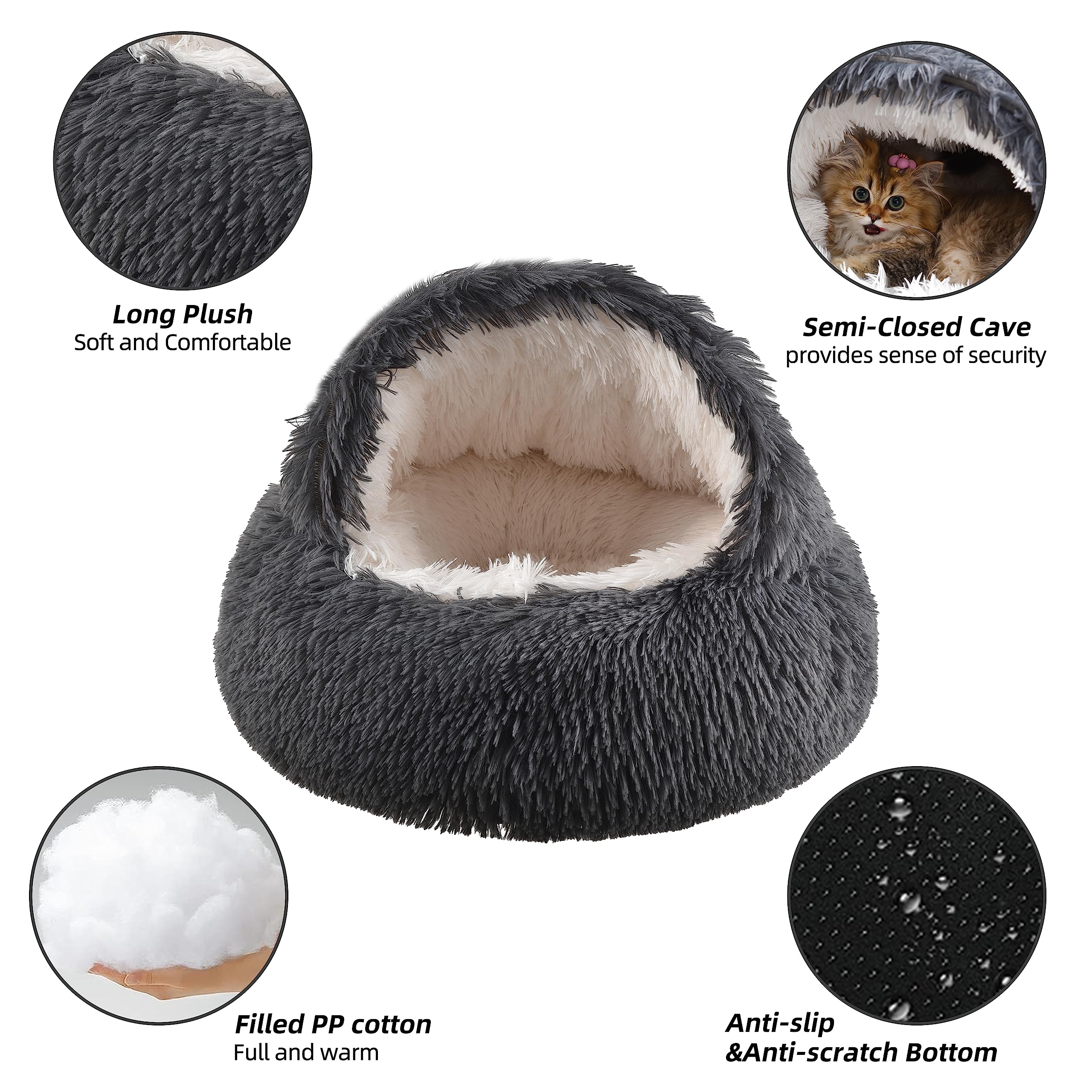 Linlinfa Flauschiges Katzenbett, Rund, Weiches Plüsch, Höhle Mit Kapuze, Katzenbett, Für Den Winter, Warm, Schlafkissen, Rutschfest, Maschinenwaschbar, Für Katzen Und Welpen-Kaffee-Plüsch