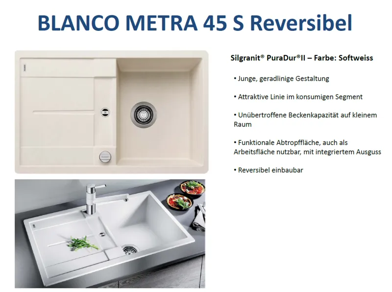 Modell: BLANCOMETRA 45 S 513035 Markenprodukt der Firma BLANCO Granitspüle / Einbauspüle mit Drehexcenter Küchenspüle Silgranit® PuraDur®II SILGRANIT® von BLANCO ist das Original Das Material besteht bis zu 80 % aus den härtesten Bestandteilen natürlichen Granits, der die Spüle so unübertroffen hart und kratzfest macht Außenmasse: 780 x 500 mm; Beckengröße: 345 x 430 x 190 mm 1 Becken-Einbauspüle aus SILGRANIT® PuraDur®; passend für Unterschränke ab 45 cm; reversibel; kratzfest; bruchfest; farbbeständig; säurebeständig; lebensmittelecht; temperaturbeständig; Farbe: anthrazit BLANCO METRA 45 S-F | Granitspüle aus SILGRANIT vulkangrau | Einbauart: Flächenbündig | reversibel | für 45 cm breite Unterschränke | Großes Becken | Reinigungsfreundliche Öberfläche Blanco Einbauspüle Metra 45 Blanco Metra 45 S-F Granitspüle, Ablauffernbedienung, Anthrazit | BÄDERMAXX Franke Spüle BLANCO Einbauspüle METRA 45 S kaufen bei . Lieferung in 24 Stunden Kostenlose Rücknahme