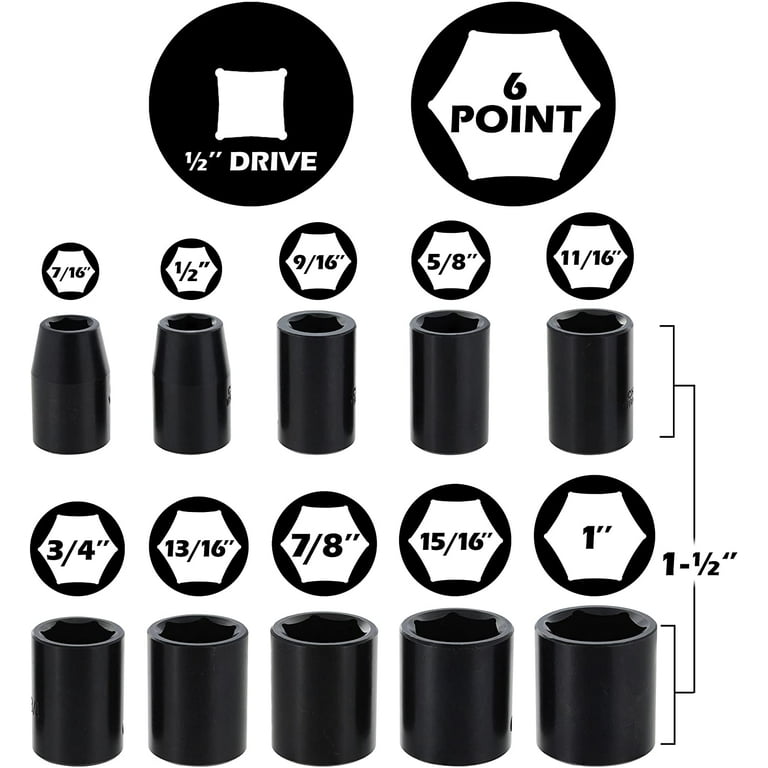 Drixet 1/2" Tief SAE/Inch Schlag Socket Set | 11 Teilig 6 Punkt CR V Steckdosen Mit Gehäuse | Inklusive Größen: 3/8, 7/16, 1/2, 9/16, 5/8, 11/16, 3/4, 13/16, 7/8, 15/16 & 1