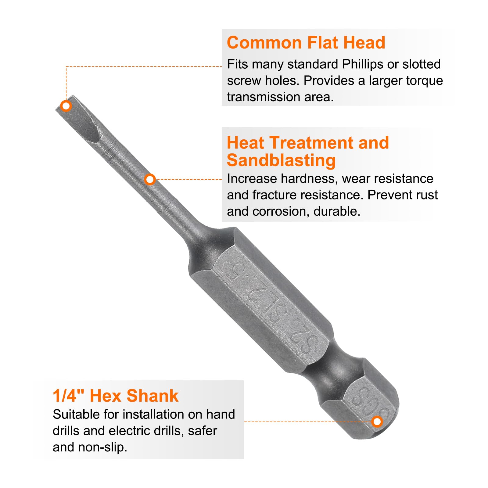 Material - Magnetische Spitzen Schraubendreher Bohrer ist aus wärmebehandeltem S2-Stahl, die Oberfläche ist schwarz phosphatiert und glatt, reduziert Reibungswiderstand, ausgezeichnete Korrosionsbeständigkeit und Rostbeständigkeit, Anti-Biegung, bruchsicher, nicht leicht zu verformen, und langlebig. für Elektriker, mechanische Reparaturarbeiten, Möbelinstallation Stellen Sie sicher, dass der Schraubendreher-Bit vor dem Betrieb fest in das Elektrowerkzeugfutter eingesetzt ist. Der Sechskantbohrer wurde speziell für das mühelose Eintreiben von Schrauben in Holz, Metall und andere Materialien entwickelt. Vermeiden Sie beim Anziehen der Schrauben übermäßige Kraft, um zu verhindern, dass der Bit beschädigt wird oder herausrutscht. Die Sechskant-Bits sind mit starkem Magnetismus entworfen, der die Schrauben vertikal oder geneigt stabil absorbieren und die Schrauben leicht fixieren kann, insbesondere auf kleinem Raum, was es bequemer machen kann, die Arbeit abzuschließen. Merkmal - Industrieller Schraubendreher-Bit nimmt ein starkes Magnetismus-Design an und kann Schrauben vertikal oder gekippt aufnehmen. Die Schraubendreher-Bits sind aus speziell wärmebehandeltem S2-Stahl mit hoher Festigkeit und Härte bis HRC58-62 (die anerkannte stabile Härte liegt bei HRC60), langlebig und biegefest, und die Oberfläche ist schwarz phosphatiert für besseren Halt und Korrosionsbeständigkeit für den industriellen Einsatz. Halten Sie es bei der Lagerung von Umgebungen mit hoher magnetischer und hoher Temperatur fern, um den magnetischen Effekt nicht zu beeinträchtigen. Überprüfen Sie vor dem Gebrauch, ob es fest am Elektrowerkzeug installiert ist. 1/4-Zoll-Sechskantschaft-Treiber-Bits können mit elektrischen Schraubendrehern, manuellen Schraubendrehern, elektrischen Bohrmaschinen usw., verwendet werden. HARFINGTON SL3/SL4/SL5/SL6 Schlitz-Schraubendreher-Bits, 6,35 Mm Der Kopf ist eine sechseckige Flachkopfform, die engen Kontakt mit der Schraube herstellen kann, wodurch die Demontage und Installation stabiler und weniger wahrscheinlich zu rutschen ist. Anwendung - Magnetischer Sechskantkopf-Bit hat ein höheres Drehmoment, wodurch es einfacher ist, Schrauben auf kleinem Raum zu entfernen und zu installieren.