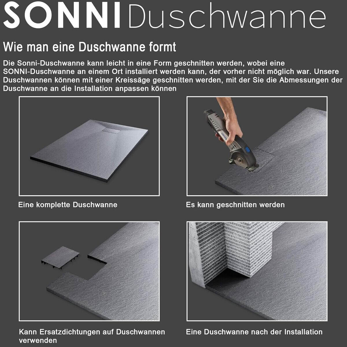 Abnehmbare Abdeckung Die Reinigung und Wartung der Ablaufgarnitur ist schnell und einfach. Die Rückseite der Duschtasse verfügt über eine Netzkonstruktion, die für mehr Gewicht und Haltbarkeit sorgt. Spezielles Design für eine versteckte Ablaufgarnitur: genau passend, langlebig und gegen Flecken. Dusche Ablaufgarnitur Maße: 120x200(mm), Ablaufloch Ø 90 mm, Material:ABS Kann leicht geschnitten und geformt werden., Einfache Montage. Material: SMC (Leichter Schiefer). Sonni design duschwanne 120x90 Begehbare Dusche SONNI Duschwanne 120x90 Schwarz 32mm Flach Duschtasse Schieferoptik Und Rutschfeste Struktur Inklusive Siphon 4419450159 90x120 Superflach Duschwanne 120x90 cm Schwarz Flach | Komplettset mit Siphon | SONNI SANITÄR SONNI Duschwanne Ein Genuss für die Füße - Gönnen Sie ihren Füßen während des Duschens eine Auszeit und genießen Sie die Bequemlichkeit an einem Strand entlang zu gehen. Natürliche Schieferoptik durch strukturierte Oberfläche: rutschfest und sicher. Natürliche Schieferoptik durch strukturierte Oberfläche: rutschfest und sicher. Spezielles Design für eine versteckte Ablaufgarnitur: genau passend, langlebig und gegen Flecken Spezielles Design für eine versteckte Ablaufgarnitur. Duschwannen und andere Baumarktartikel günstig online kaufen bei Möbel & Garten.
