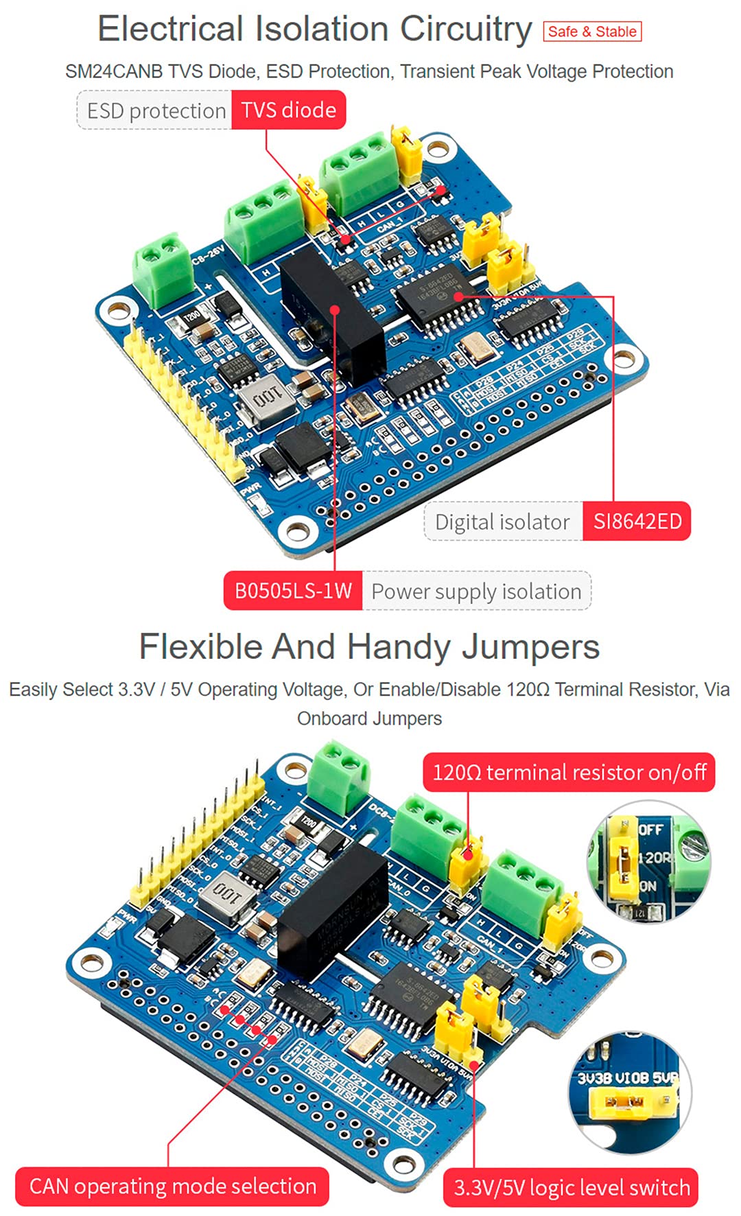 Raspberry Pi Zero 2-Channel Isolated CAN SPI Bus Expansion HAT For Raspberry Pi Dual Chips For Expanding Multiple Can Raspberry Pi Can Bus Expansion Dieser HAT unterstützt die Erweiterung mehrerer CAN-Kanäle durch sein stapelbares Design und ist somit geeignet für komplexe Anwendungen, die robuste Kommunikationsnetzwerke erfordern 【Compatible with Raspberry Pi / Jetson Nano】Standard Pi 40 PIN GPIO expansion connector,suitable for Raspberry Pi series boards / Jetson Nano 【Support 2-Channel】Equipped with a MCP2515CAN controller and SN65HVD230CAN transceiver, it allows 2-channel CAN communication. 5/4B/3B/2B/Zero/Zero W/Zero WH/Jetson Nano 2-CH CAN HAT+ Stackable Design for Expanding Multiple CAN Channel. From iiunius. 4.6 out of 5 stars, 3 ratings Coolwell for Raspberry Pi 2-CH Isolated CAN Bus Expansion HAT Dual 【Digital isolaton】Onboard digital isolator,signal isolation communication is safer and more stable,with strong anti-interference ability. 【Onboard jumpers】Equipped with SM24CANB TVS (Transient Voltage Suppressor) diodes,ESD protection and transient peak voltage protection for safer and more satble,Onboard voltage conversion circuit, select 3., 3V/5V operating voltage by jumper.