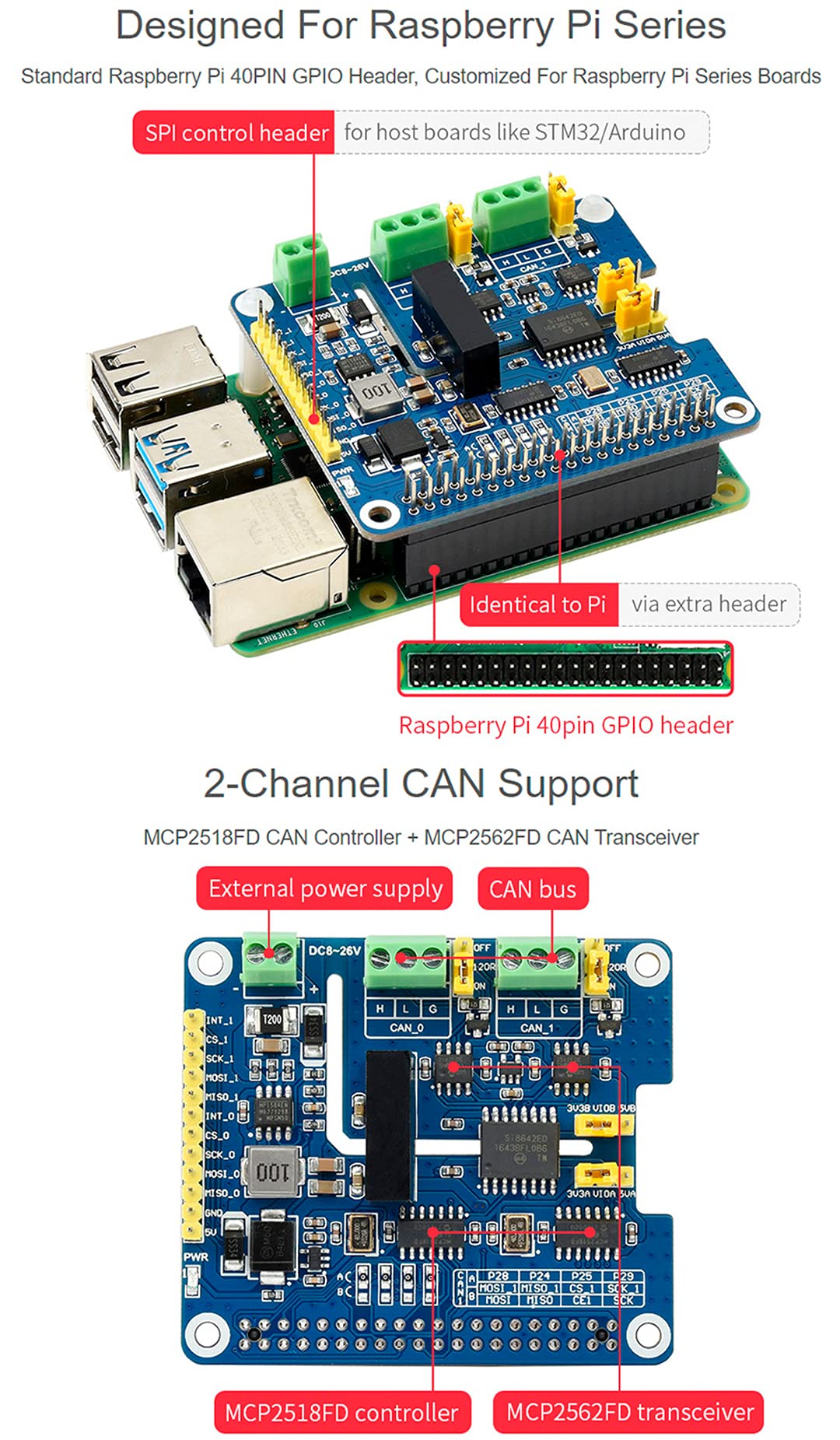 2-Channel Isolated CAN SPI Bus Expansion HAT For Raspberry Pi Dual Chips For Expanding Multiple Can
