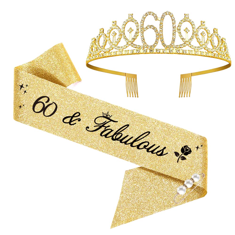 SZHUIHER 60. Geburtstagsschärpe Und Tiara, Rose Gold Geburtstagsschärpe Krone 60 & Fabulous Schärpe Und Tiara Für Frauen, 60. Geburtstagsgeschenke Für Alles Gute Zum 60. Geburtstagsgeschenk
