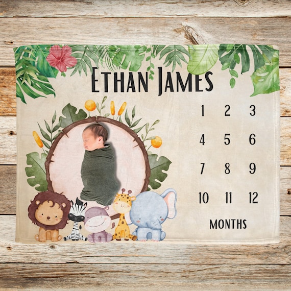 Meilenstein-Decke Safari-Tier, Baby-Decke Für Jungen, Individueller Name, Babys Erste Tage, Dschungel-Wachstum-Tracker, Personalisiertes Neugeborenen-Duschegeschenk