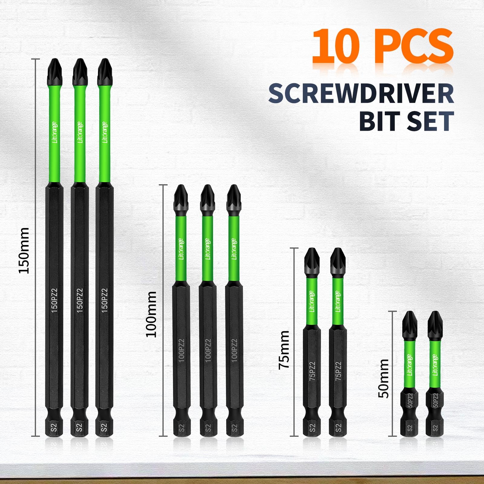 LitOrange PZ2 Magnetische Schlagschrauber Bits, 10 Stück, Strapazierfähig, Lang, Pozidriv Schraubendreher Bit Sets, 150 Mm, 100 Mm, 75 Mm, 50 Mm