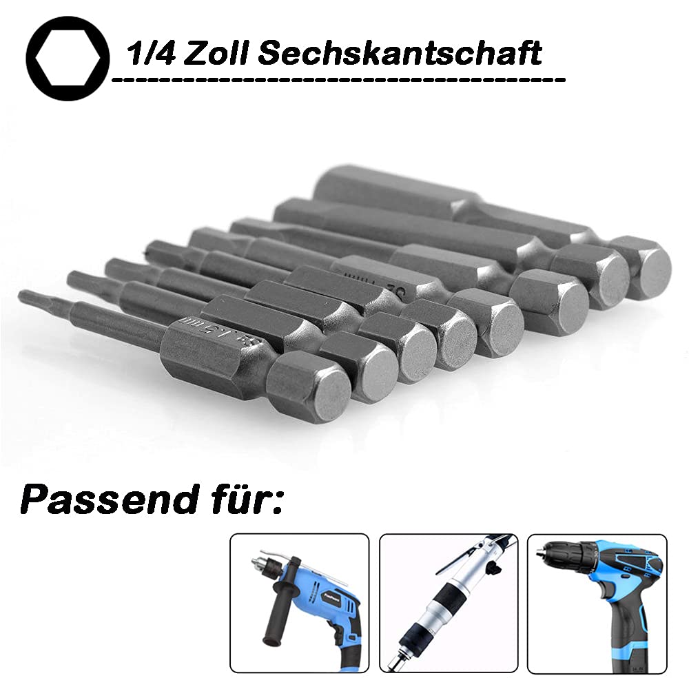 Kopftyp: Sechskant-Kopf; Sechskantschaft: 6,35 mm / 1/4 Zoll; Länge: 100 mm / 4 Zoll. Stark magnetisch, einfach anzusaugen, verbessert Ihre Effizienz beim Schrauben. Geeignet für elektrische Schraubendreher, Hand-Schraubendreher, Bohrer, Luftbohrer und so weiter Hinweis: Nicht drehen Schrauben mit unterschiedlicher Größe, falls sowohl die Schraube als auch der Bohrer beschädigt werden. Spezifikation: Material: S2 Stahllegierung , Kopftyp: Sechskantkopf (Innenbohrer) , Vorbau: 1/4 Sechskantschaft , Imperial SAE-Größe: 5/64, 3/32, 7/64, 1/8, 9/64, 5/32, 3/16, 7/32, 1/4, 5/16 Starker Magnet: Die Sechskantspitze ist magnetisch, wodurch die Spitze fest am Schraubendreher befestigt werden kann, was die Arbeitseffizienz verbessert. Magnetbohrer, kann Schrauben leicht absorbieren, bequem zu bedienen, bietet hohe Effizienz. Gesamtlänge: 50 mm/2 Zoll Weit verbreitete Elektrowerkzeuge, elektrische Schraubendreher Montage, Elektronikindustrie, Haushaltsgeräte, Präzisionsinstrumentenindustrie, Schraubenausrüstung der Möbelindustrie. RT Innensechskant 1.5mm (1) für Akkuschrauber100MM Tungsten Steel Power Tip only Inbus Bit Set Lang Magnetische Imperial Hex-Schraubendreher-Bits Inbusschlüssel Hex Bit Set Günstige Innensechskant-Schraubendreher als Einzelwerkzeug oder Set, für Industriebetriebe oder den Heimgebrauch: Die Verkäufer bei bieten, was das Herz begehrt Imperial Größe: 5/64, 3/32, 7/64, 1/8, 9/64, 5/32, 3/16, 7/32, 1/4, 5/sechzehn; Kopftyp: Sechskantkopf, Schaft: 1/4-Sechskantschaft 6,35 mm, Gesamtlänge: 50 mm.