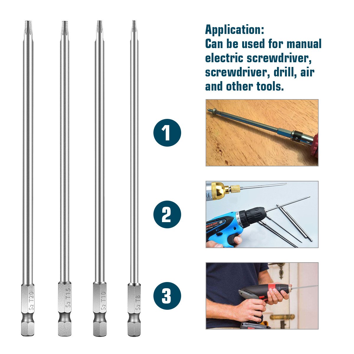 Art des Schaftes: 6,35 mm/1/4 Zoll Hex, Materialien: S2 legiertem Stahl ;Typ des Kopfes: Torx ; Länge von 15cm kommt man vermutlich überall hin. Es sind die Größen: T8, T10, T15, T20, T25, T27, T30, T40 enthalten, welche für Hausgebrauch voll und ganz ausreichen. Magnetischen Bits, Dank magnetisierung haften die Schrauben auch am Bit und gerade in tieferen Löchern muss man den Gegenstand... Torx-Bit Lang Torx Bits Set 150mm 1/4 Schraubendreher T8-T40 Elektrischer Schraubendreher 8tlg Torx Bits Schraubendreher Set Extra Lang (150Mm Schraubendreher Elektrisch 8X TORX BITS Schraubendreher Set Extra Lang = 150mm & Magnetisch S2 Set - EUR 16,04. ZU VERKAUFEN! Stark magnetisch, hohe Präzision. 8 Stück x Torx-Schraubendreher-Bit. Einfach zu verwenden. Art 236437511328