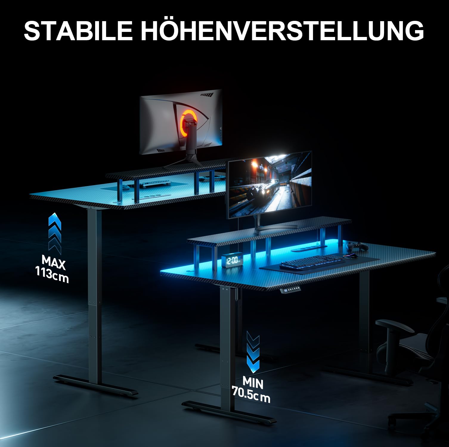Die Tischplatte in schwarzer Carbon-Optik im Format 140 cm breit und 60 cm tief besteht aus zwei Teilen, das mitgelieferte Mauspad deckt die beiden Übergänge komplett ab, sodass Sie keine Beschwerden verspüren. Der Motor verfügt über einen Überhitzungsschutz und eine intelligente Überlastungserkennung, die Motorschäden oder Sicherheitsunfälle effektiv vermeiden und die Lebensdauer verlängern. EE EUREKA ERGONOMIC Stehpult Höhenverstellbar, Elektrisch Standing Desk Gross Gaming Schreibtisch Mit Led Monitorstaender Und Tastaturablage 2 Paket Hoehenverstellbar Computertisch 182 76cm Fluegelform Gaming Tisch Lastkapazitaet 100 Kg S0mcm0ct Gaming tisch mit Steckdosenleiste] Dieser Gaming-Schreibtisch wurde speziell für Gamer entwickelt! Die Tischplatte ist mit 3 AC-Steckdosen und 2 USB-Anschlüssen ausgestattet, die gleichzeitig bis zu 5 elektronische Geräte mit Strom versorgen können 【Professioneller Kundendienst】 Bitte seien Sie versichert, dass wir mit allen notwendigen Montagewerkzeugen und Montageanleitungen ausgestattet sind, um sicherzustellen, dass Sie die Montage des elektrischer schreibtisches leicht abschließen können. Dieser elektrisch verstellbare Gaming-Schreibtisch hat einen stabilen, höhenverstellbaren Rahmen von 72 cm bis 117 cm, sodass Sie die Höhe nach Ihren Wünschen anpassen und Ihre Spiele spielen oder an Ihrem Computer arbeiten können, während Sie am Schreibtisch stehen. Die Größe dieses Schreibtisches ist 140 cm breit, 60 cm tief und höhenverstellbar von 72 cm bis 117 cm hoch.Lieferung inkl. Juskys Schreibtisch Office Stand 140 x 60 cm Weiß Die Tischbeine aus industriequalitativen kaltgewalzten Stahlrohren in T-Struktur tragen bis zu 80 kg. Das Desktop besteht aus FSC-zertifiziertem Holz für nachhaltige Herstellung. 【Sicherheitsgarantie】 Jeder Computertischs Hubmotor durchlief über 20., 000 strenge Tests, um hohe Standards zu gewährleisten. Wenn Sie irgendwelche Fragen haben, zögern Sie nicht, uns zu kontaktieren, wir haben ein professionelles Kundenservice-Team, um sicherzustellen, dass innerhalb von 24 Stunden zu beantworten Sie, Kundenzufriedenheit ist unsere größte Motivation! 【Monitorständer mit LED-Beleuchtung】 Dieser Schreibtisch verfügt über einen ergonomischen Monitorständer, der optimalen Gaming- und Bürokomfort bietet und Nacken- sowie Augenbelastung bei längerem Gebrauch verringert. Unter dem Ständer befindet sich eine verstellbare LED-Beleuchtung mit verschiedenen Farb- und Lichtmodi. Er verfügt über 3 intelligente Speichertasten, mit denen Sie 3 verschiedene Höhen nach Ihren Bedürfnissen oder denen Ihrer Familienmitglieder voreinstellen können. Über eine App können Sie die Lichteffekte ganz einfach wechseln und je nach Bedarf eine individuelle Atmosphäre schaffen für ein noch intensiveres Gaming-Erlebnis! Rollbarer Schreibtisch – Die 15 besten Produkte i Vergleich Montageanleitung und benötigter Teile + Getränkehalter + Kopfhörerhaken.
