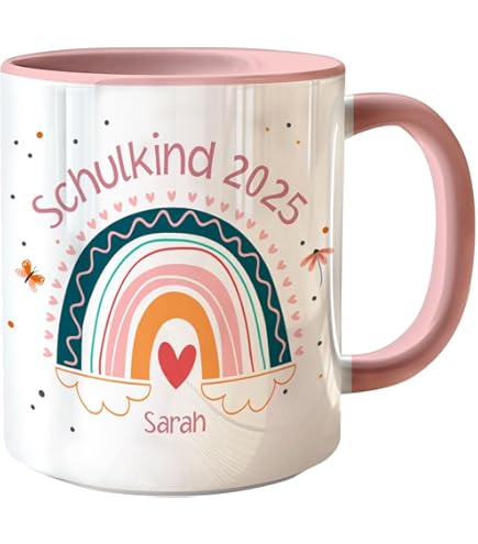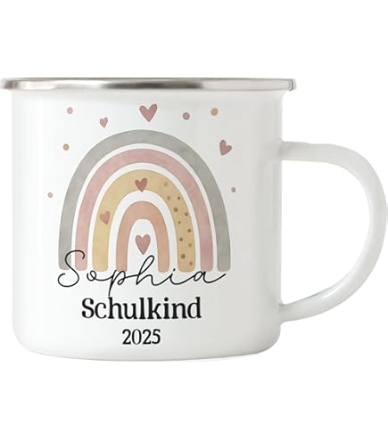 Schulkind Tassen | Geschenke zu Einschulung & Schulanfang kaufen bei Das passende Motiv, wenn du nach Folgendem gesucht hast:- tasse schuleinführung personalisiert- einschulung tasse personalisiert- emaille tasse personalisiert einschulung- tasse zur einschulung mit namen- einschulung personalisiertBedruckter Emaille Blechbecher Unser Emaille-Becher ist der perfekte Begleiter für alle, die stilvoll unterwegs sein möchten. Auf was wartest du noch? Schlag direkt zu! Die Tasse aus Emaille zum Schulstart wird mit dem Namen des Kindes und der passenden Haarfarbe personalisiert. Mit deiner liebsten Farbkombination wird der Blechbecher Emaille zu einem echten Retro-Accessoire und verleiht deinem Getränk das gewisse Extra. Schultüte, Schulbuch, die passende Kleidung und süße Geschenke dürfen am Schulbeginn natürlich nicht fehlen! Der weiße Metallbecher mit abgesetztem Rand bietet ein Fassungsvermögen von 300 ml und ist kratz- und schnittfest. Unser Emaille-Becher ist der perfekte Begleiter für alle, die stilvoll unterwegs sein möchten. Der weiße Metallbecher mit abgesetztem Rand bietet ein Fassungsvermögen von 300 ml und ist kratz- und schnittfest Mach jetzt deinem Schützling eine riesige Freude mit diesem süßen Motiv mit deinem Wunschtext! Mit dem eigenen Namen personalisiert, wird aus einer einfachen Tasse ein fester Platz im neuen Schulabenteuer. Ein p ersönliches Geschenk zum Schulstart und perfekt für die Schultüte Wähle zwischen einem weißen Becher mit schwarz oder blau glasiertem Rand oder der Variante mit silbernen Metall-Rand. Damit der Schulkind-Look zum 1., Schultag gelungen ist, werden Jahreszahl, Regenbogen und Herzen zu einem Gesamtbild verbunden. „Schulkind 2025 ist eine schöne Grafik und außerdem das Highlight zum Schulanfang Einschulung Grafik: Das Thema Schule erfreut sich immer größer werdender Beliebtheit und du suchst passende tasse dazu. Patentanten und Großeltern bereiten ihrem Schützling damit schon lange eine Freude. Außerdem ist er geschmacks- und geruchsneutral und somit perfekt für alle Heiß- und Kaltgetränke geeignet. Schönes Motiv Regenbogen Schulkind 2025 zum SchulbeginnWenn du ABC-Schützen, Kindern oder Grundschüler zur Einschulungsfeier eine Überraschung bereiten möchtest, liegst du mit dieser süßen Grafik richtig! Einschulung Stifte Emaille Becher Blechbecher - Einschulung Schulanfang Tasse - Regenbogen Schulkind - 300 Ml - Weiß Silber - Schulanfänger Geschenke Einschulung- Schulkind 2022 Mädchen Name Trinkbecher 2023 Glückwunschkarte Schulanfang 130 gFüllmenge: ca 300ml Mit diesem Motiv machst du deinen Kleinen eine Riesenfreude und sorgst dafür, dass sie für ihren großen Tag perfekt ausgestattet sind. Also schlag direkt zu! Für den Schulbeginn kannst du dieses süße Design mit Regenbogen und Herzen genau deiner Wunschvorstellung anpassen. Für Jedermann das perfekte Design: Bringe deinen Nachwuchs mit diesem süßen Design zum Strahlen.