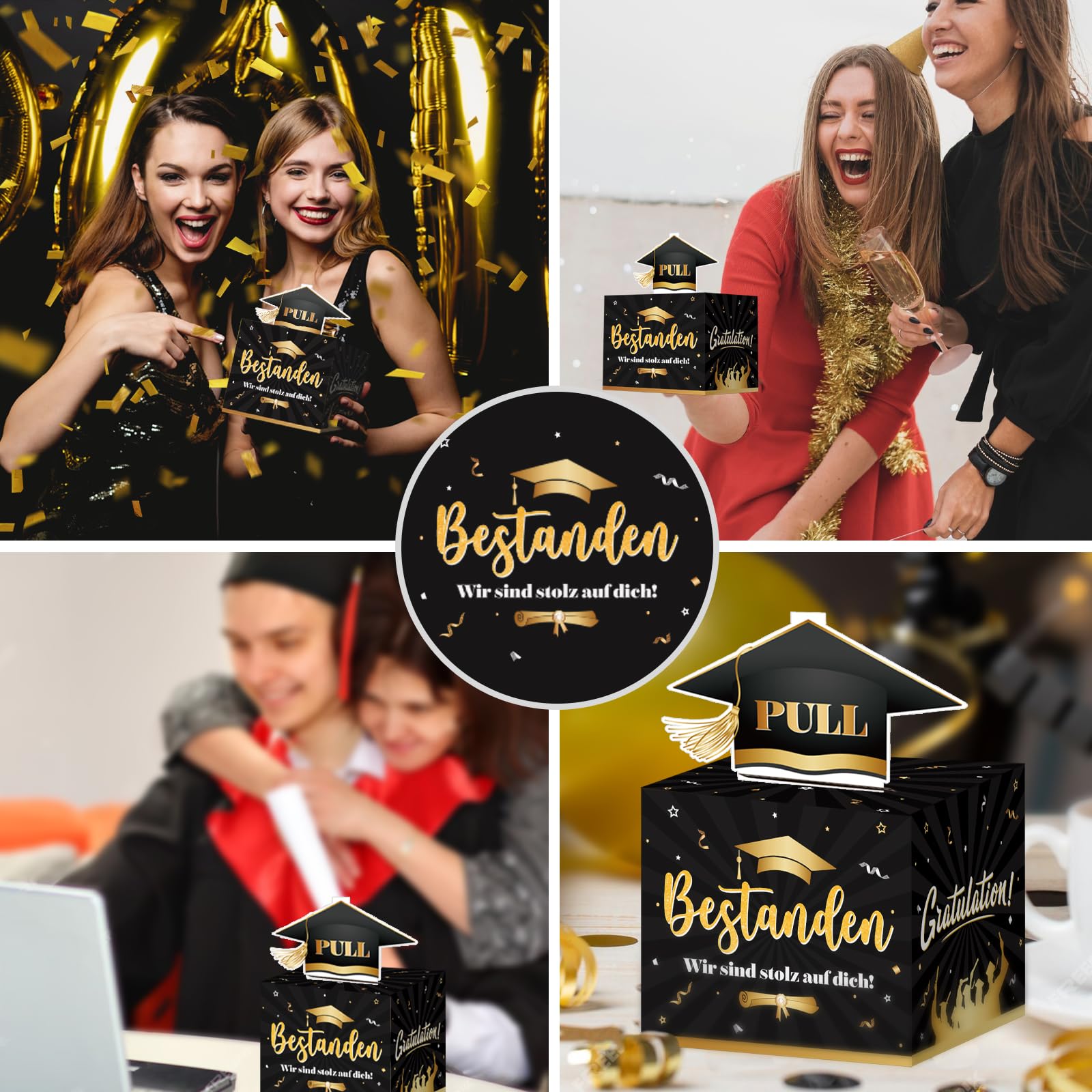 Paketinhalt] Sie erhalten ein Set mit schwarz-goldenen Abschlussdekorationen, darunter 1 Glückwunschbanner zum Abschluss und 12 Cupcake-Topper Abitur 2025 Geldzeichnung Geschenk Box Set: Lieferumfang 1x Geschenkbox (schwarz-gold), 1x Bachelor Hut-Mechanismus, 30 x Zellophanbeutel. Abitur 2025 Geldzeichnung Geschenk Box Graduation Party Deko Schwarz Gold Congrats Grad Geschenkbox Bestandene Prüfung Bachelor Master Abschluss Geschenkkarton Atmosphäre Requisiten (13X13X11CM) BOOMTOP Bestanden Banner Abschluss Deko 2025 Prüfung Bestanden Girlande Master Geschenk Graduation Deko Schwarz Gold Abschluss Deko 2025 Abitur Bachelor Box Für Geldgeschenke 2025 Die mitgelieferten Zellophanbeutel sorgen für den perfekten Pull Effekt. Graduation Geschenke für Ihn/Ihn ]: Diese gold schwarze Graduation Dekoration Pack ist ein ideales Graduation Geschenk für Ihre Klassenkameraden, Tochter, Sohn, Neffe oder Nichte