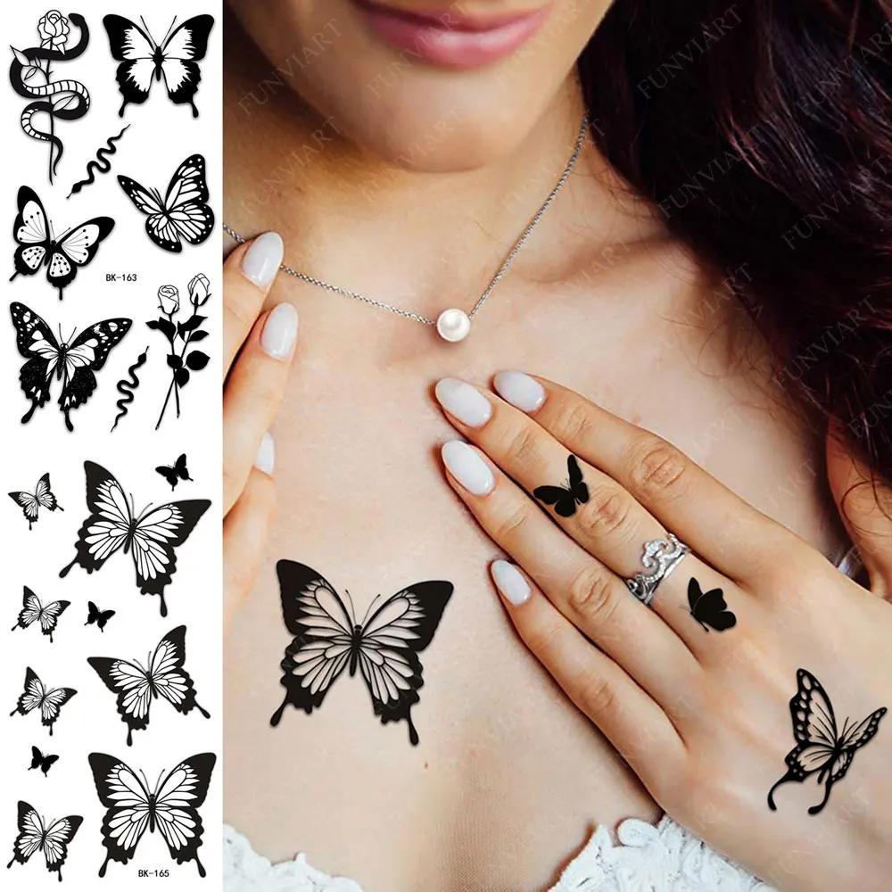 8 Blätter Groß Schwarz Schmetterling Temporäre Tätowierung, Wasserdicht Erw