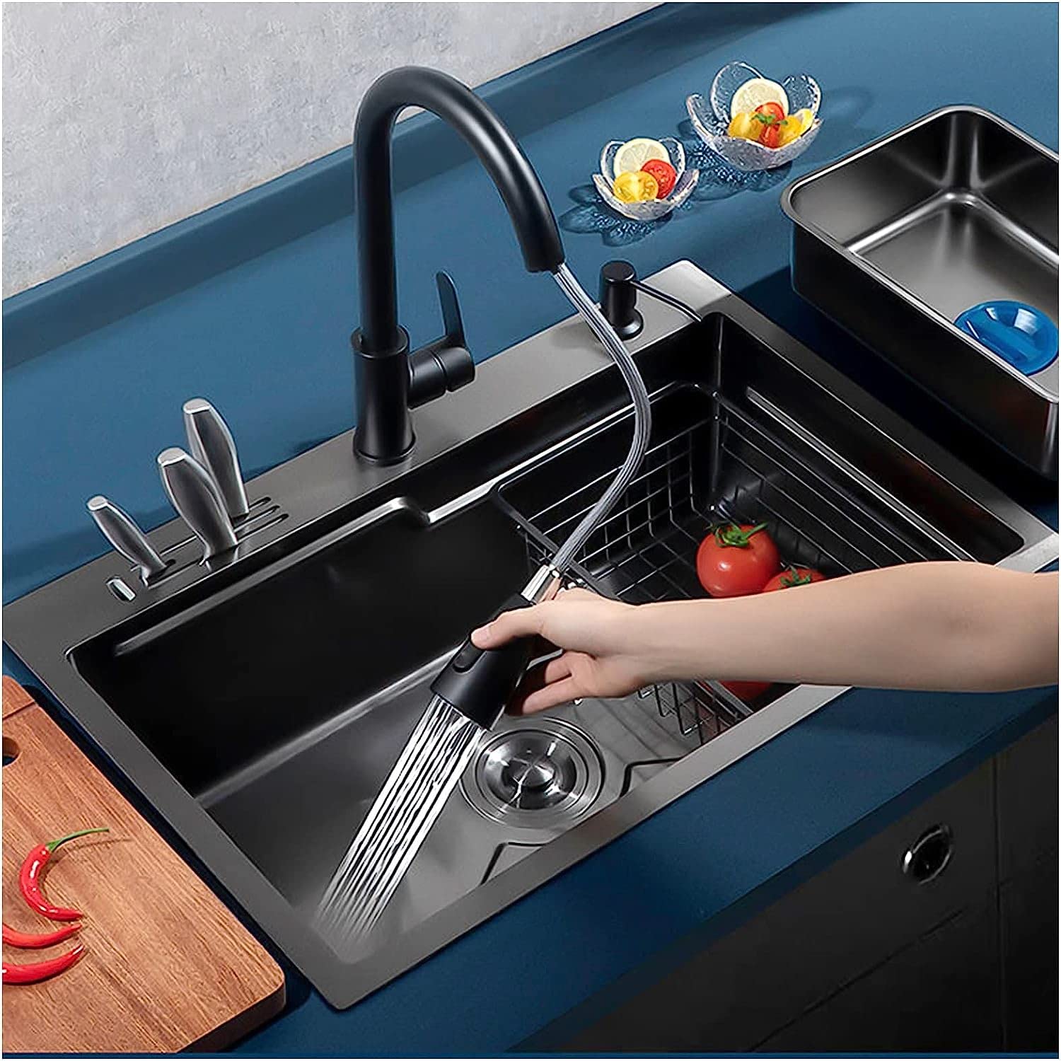 Die Antikondensations-Oberfläche verhindert, dass sich Feuchtigkeit auf der Oberfläche der Barspüle-Materialien ansammelt, gut isoliert für die Verwendung mit Eis Alle Zubehörteile sind gut verarbeitet und unglaublich nützlich. Die einzelne Schüssel ist schön und meist einfach zu installieren und zu reinigen. Spülbecken Schwarz Mit Armatur Set Schwarze Küchenspüle, Unterbau-Edelstahl-Barspüle, 76,2 X 45,7 X 22,9 Spülbecken 80x50 Verwandeln Sie Ihre Küche mit unserer Wasserfall-Küchenspüle, erhältlich in 76,2 cm Breiten. Diese vielseitige Spüle verfügt über ein schlankes Design, ein integriertes Schneidebrett und ein effizientes Abtropfgestell X-förmiges Bodendesign: Das X-förmige Startdesign an der Unterseite der Drop-in-Spüle hilft, Wasseransammlungen zu verhindern und fördert eine effiziente Entwässerung. SS-Küchenspüle lässt alles abtropfen und Sie müssen selten etwas herumjagen, um es in den Abfluss zu bringen. Maße der Edelstahl-Küchenspüle: 2-Loch 11 Gauge SS-Küchenspüle hat die Größe der Außenmaße: 76,2 cm B x 45,7 cm L x 22,9 cm D, Innenmaße: 71,1 cm B x 40,6 cm L x 22,9 cm D. Geräuschreduzierung Einzelspüle: Leise 3 mm dicke Gummimatte für schwarze Edelstahl-Küchenspüle könnte den Lärm erheblich reduzieren, der besonders hilfreich in Häusern für diejenigen sein könnte, die schlafende Babys oder Mitbewohner haben. Küchenspüle mit R10 rundem Design bietet viel Platz für Töpfe und Pfannen. YINXSLO Küchenspüle Schwarze Edelstahlspüle Einbecken-Wasserfallspüle Praktische multifunktionale Spüle und Abtropffläche mit Mischbatterie (75 Schwarze Doppelbecken-Küchenspüle, 81,3 cm, Unterbau 50/50 Arbeitsplatzspüle mit Zubehör, 81,3 x 45,7 x 25,4 cm, große und tiefe Edelstahl-Handarbeitspüle, 25,4 cm Tiefe