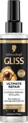2–3 mal zur Haarpflege wöchentlich anwenden</li</ul Die Produktvorteile im Detail:Haarkur für extrem geschädigtes HaarIst schon nach 1 Minute wirksamFür bis zu 10 x mehr Widerstandskraft¹ und GlanzMit flüssigem Keratin&Perlen-Extrakt100 % stärkeres Haar¹Anwendung: Sanft nach dem Waschen im feuchten Haar verteilen.1 Minute einwirken lassen.Gut ausspülen! Eine gute Spülung, die die Haare weich macht und dauerhaft pflegt Schwarzkopf Gliss Total Repair Schwarzkopf Gliss Kur Spülung Ultimate Repair 200 Ml, 6er Pack Von Gliss Kur Express Repair Spülung Die Gliss Spülung ist von PETA² zertifiziert und der Flaschenkörper besteht aus 100 % recyceltem Kunststoff³</li<liEinfache Anwendung – Vor Gebrauch schütteln und nach jeder Haarwäsche zur Haarpflege in handtuchtrockenes oder trockenes Haar sprühen. 98 % der Inhaltsstoffe sind natürlichen Ursprungs². Beim Gliss Kur Ultimate Repair Express-Repair-Spülung handelt es sich um eine Spülung, die deinem geschädigten und trockenen Haar nach dem Waschen Glanz verleiht und das Durchkämmen erleichtert Sie sind auf die speziellen Bedürfnisse der Haare zugeschnitten und sorgen für Reparatur und eine sichtbar verbesserte Haarqualität.