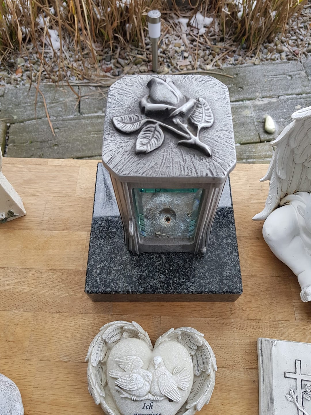 in Farbe Grau angestrichen.Höhe absolut ca.23 cm. Grablaterne Friedhof Wetterfest KOKA Grab-Lampe Granit Schwedisch Black Edelstahl Grab-Schmuck Weihnachtsbaum Für Grab Lieferumfang: Grablampe mit Edelstahl aus Granit Schwedisch Black Maße Grablampe Höhe: ca., 24 cm Breite: ca., 13,3 cm Tiefe: ca. Der moderne Grabschmuck ist handgefertigt und auf Hochglanz poliert. Durch die glatte Oberfläche ist die Grablampe witterungsbeständig und robust. Der... Moderner Grabschmuck welcher handgefertigt und auf Hochglanz poliert wurde. 13,3 cm Maße Edelstahltürrahmen Höhe: ca., 18 cm Breite: ca., 12,5 cm, Handgefertigt , Auf Hochglanz poliert , Witterungsbeständig , Robust Dieser Grabschmuck verfügt über eine Tür wodurch die Grabkerzen zugänglich sind. Durch die glatte Oberfläche ist die Grablampe witterungsbeständig und robust. Der Grabschmuck verfügt über eine LED Beleuchtung und eine große Ecktür wodurch die Grabkerzen zugänglich sind im Shop über 250 weitere Grabartikel 256103876315 Details zur Grablaterne:Höhe: 23 cmDurchmesser: 15 cmGewicht: 3,5 kg Lieferumfang:Grablaterne mit Sockel Die angegebenen Abmessungen und Farben können geringfügig von den tatsächlichen Eigenschaften des Produkts abweichen. designgrab Grablape odern it Vase Elegance und 2 Stück Sockel aus