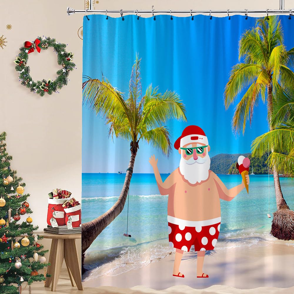 Weihnachtsmann Strand Duschvorhang Lustig Weihnachten Tropische Palme Ozean Seestern Muschel Surfbrett Sommer Meer Winter Urlaub Neujahr Kreative Stoff Bad Dekor Badezimmer Vorhang Set Mit Haken