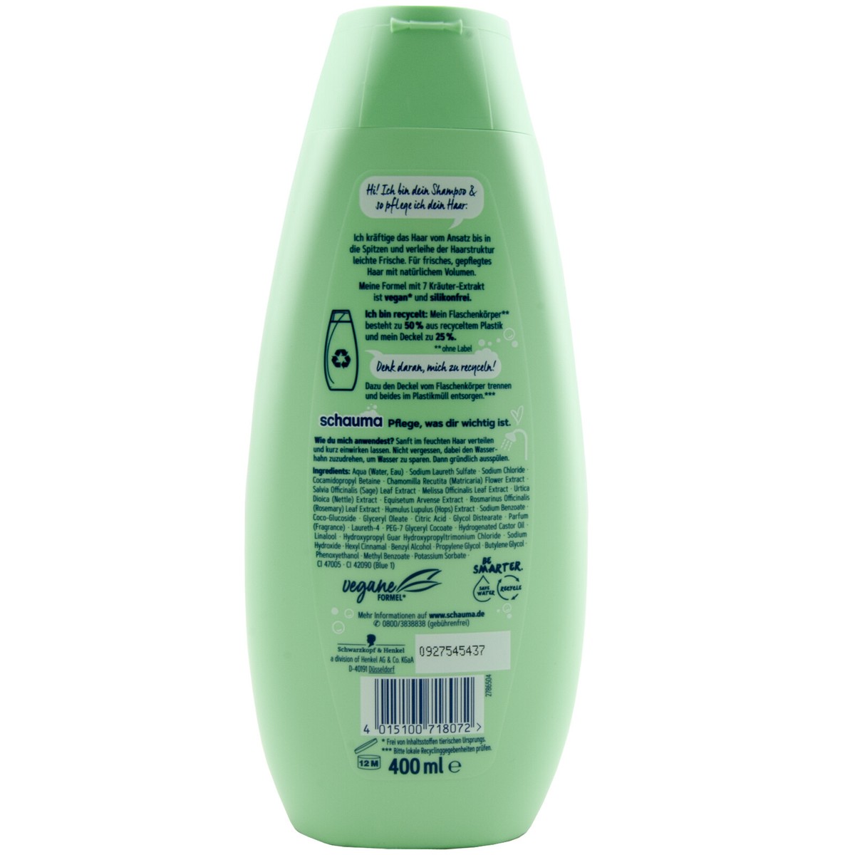 Schauma Shampoo Schauma Frische Shampoo Sieben Kräuter Fettendes Haar 400ml 4er Pack Schauma 7 Kräuter Shampoo Nachfüllpack Schauma Shampoo 7 Kräuter 400ml bei Flink online bestellen Schwarzkopf Schauma Shampoo - Frische & Volumen Shampoo 7 Kräuter Gebrauchsanweisung Anwenden auf nasses Haar, Einmassieren zu einem Schaum, Gründlich ausspülen, Ohne Silikone , Vegan Mit dem Shampoo 7 Kräuter von schauma erleben Haare eine kraftvolle Pflege, die speziell für fettiges bis normales Haar entwickelt wurde. Durch die belebende Formel mit 7 Kräuter-Extrakt wird das Haar vom Ansatz bis in die Spitzen kräftig gestärkt und sanft von überschüssigem Fett befreit