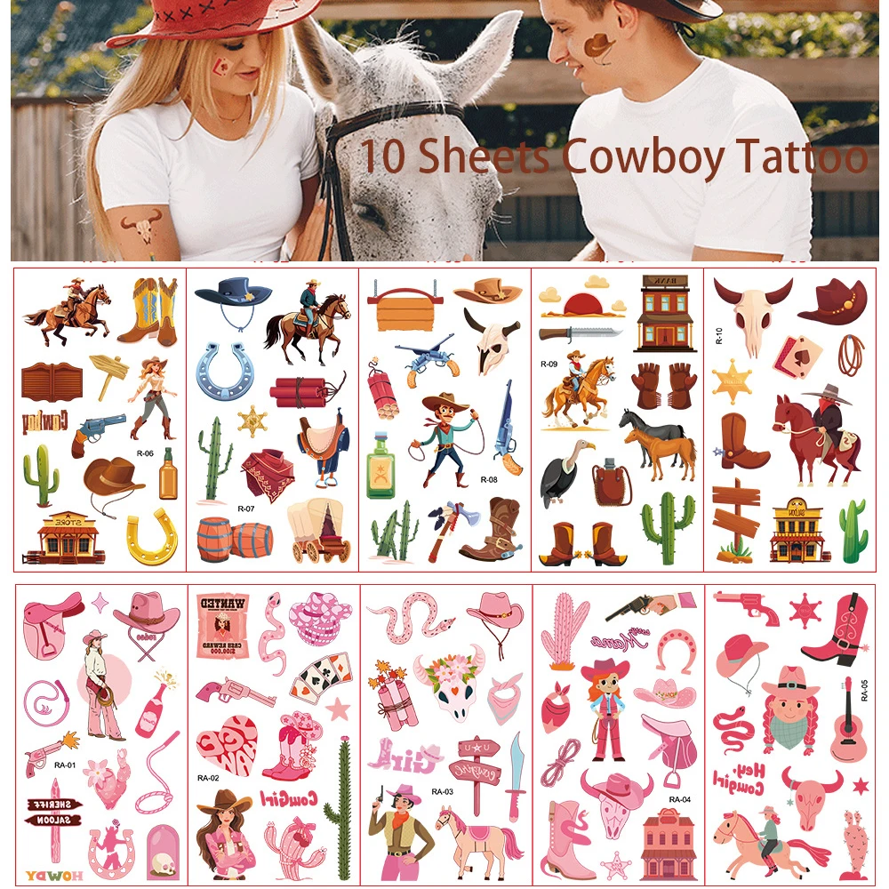10 Sheets Western Cowgirl Theme Temporary Tattoos Cowboy Boot Hat