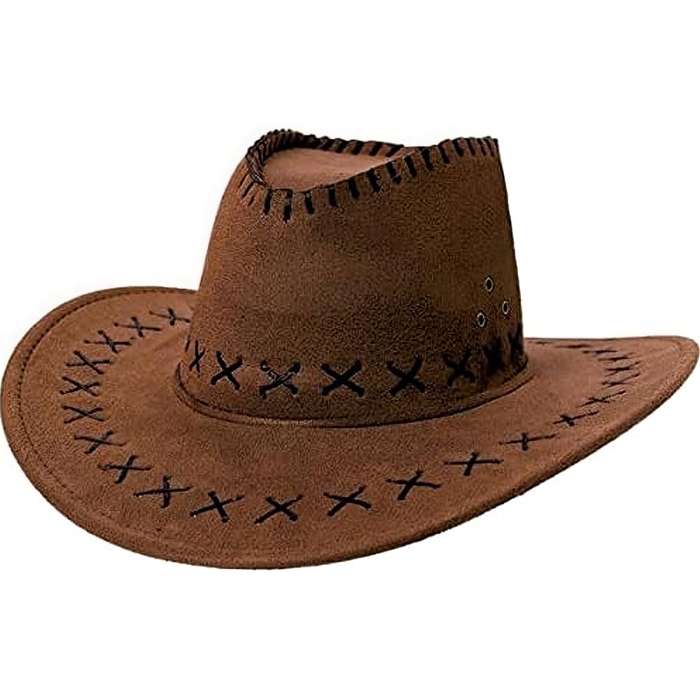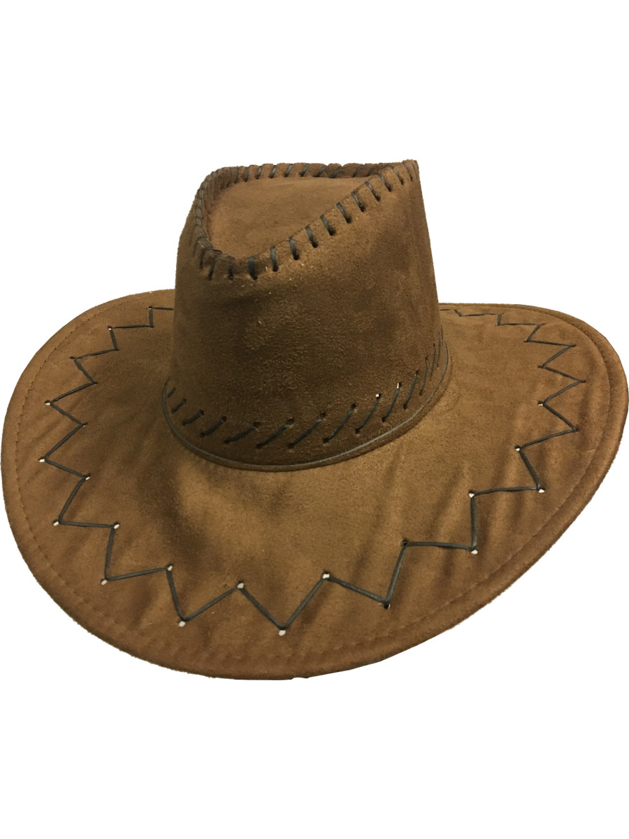 FAUX SUEDE COWBOY HAT BLACK BROWN COWGIRL ADULTS WESTERN WILD WEST FANCY DRESS $7.98 + $18.90 shipping It's high noon and now it is time to get back on your horse! This novelty cowboy hat has a suede-like finish with a curved brim and pinched crown. This western-style hat features a studded band and attached cord to provide secure fit Suede Cowboy Hat Western Style Sturdy Hand Wash Wide Brim For Birthday Party Brown Tonies Wicked Cowboy Western Wild West Sheriff Hat Fancy Dress Halloween Western Cowboy Hat Venice Hat Pentagram Hat Hut Damen