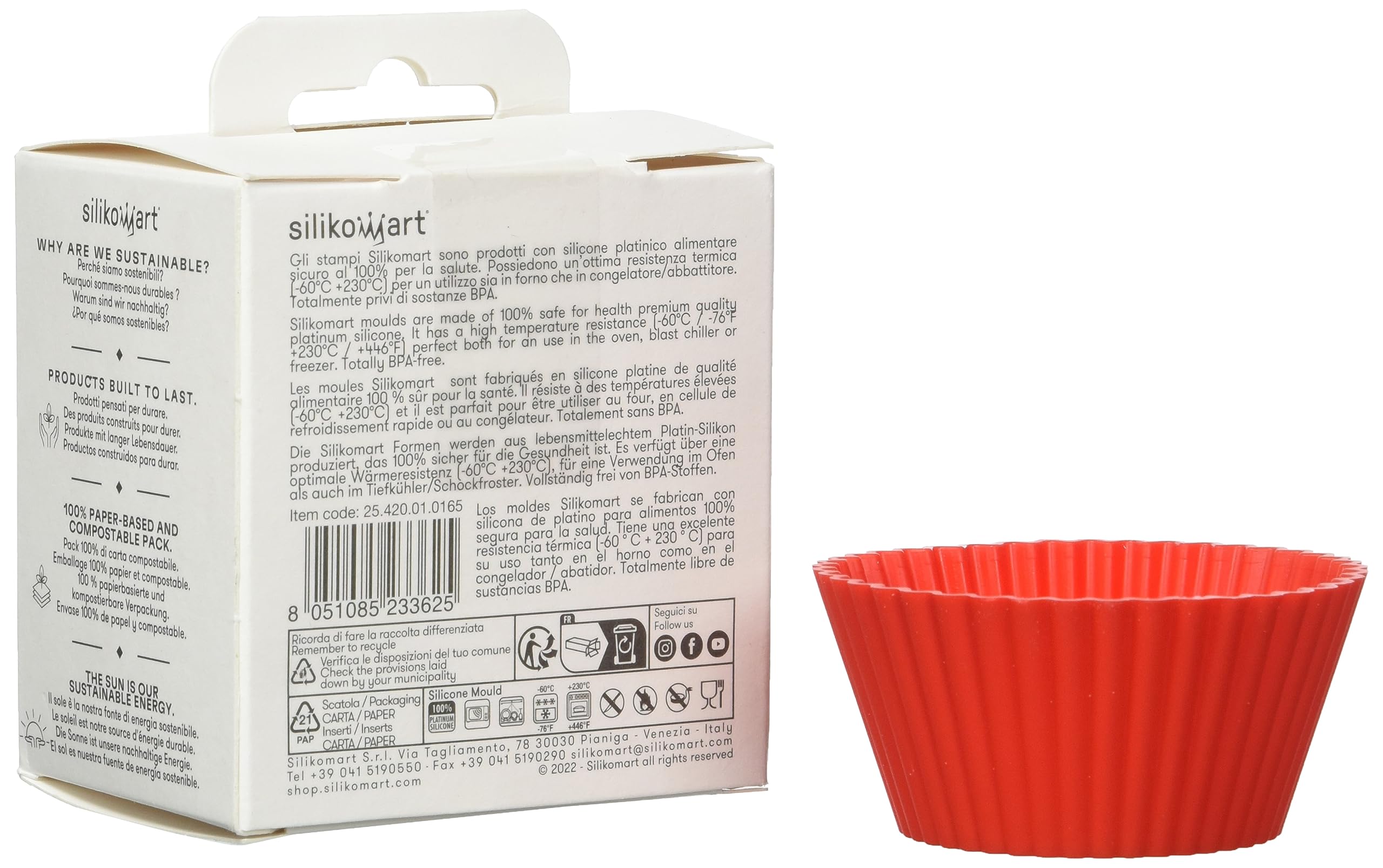 Round Silicone Mould - Intreccio - 18cm - Silikomart - Meilleur du Chef Eine Mischung aus modernen Linien und leuchtenden Farben für eine Reihe von Formen, die sich für verschiedene Zubereitungen eignen, sowohl für gebackene als auch für halbgebackene. Die Silikonformen sind spülmaschinenfest für maximalen Komfort und bieten ein platzsparendes Design, das perfekt in Ihre Küche passt. Wiederverwendbar für bis zu 3000 garantierte Brennvorgänge, ideal für den sicheren Langzeitgebrauch. Packung mit 1 Form, insgesamt 6 Einzelportionen. About this item Dimensions: Height 75 mm Diameter 60 mm Flexible cake-tins and multiform moulds Cake-tin is equipped with practical safe ring Support ring ensures stability to the mould Designed to provide faultless result Non-stick silicone moulds See more product details Silikomart Formen Silikomart Muffin-Silikonform ø75 H 60 Mm Silicon Muffinbackformen PLATIN-SILIKON: Hergestellt aus hochwertigem, lebensmittelechtem Platin-Silikon, 100% sicher für die Gesundheit. Volumen: 6 x 165 ml, Total: 990 ml. Größe: Ø 75 h 60 mm. MUFFIN MOULD: Elegant und kreativ, eine klassische Kollektion mit verschiedenen, sich ergänzenden Formen und Stilen für jede Gelegenheit. Perfekt für die Wiederentdeckung klassischer und zeitloser Formen, ideal für die Kreation köstlicher Rezepte mit perfekten Ergebnissen vom ersten Backen an. Silikomart verkörpert seit über 20 Jahren die Leidenschaft für die Süßwarenkunst, mit einer starken DNA, die auf Innovation und Made in Italy ausgerichtet ist. Wir arbeiten mit Pionieren der Branche zusammen, um das kreative Genie von Meisterkonditoren in revolutionäre Kunstwerke zu verwandeln. Entdecken Sie die Freude an der Kreation neu, dank der Formen von Silikomart, die Ihre köstlichsten Rezepte in die Tat umsetzen und ein perfektes Ergebnis schon beim ersten Backen garantieren. Die Wiederentdeckung klassischer, zeitloser Formen, die Sie immer wieder gerne für Ihre Kreationen verwenden werden. Mit italienischem Design und italienischer Produktion sind wir innovativ, indem wir avantgardistische Formen kreieren, die die Grenzen des Geschmacks verschieben und das kreative Genie zeitgenössischer Meisterkonditoren in außergewöhnliche Kunstwerke verwandeln und globale Qualität und Exzellenz garantieren. Das Silikomart 20.052.00.0060 SF 052 Muffin - Silikonform ø75 H 60 M ist ein vielseitiges und praktisches Küchenutensil, das Ihre Backkreationen auf das nächste Level hebt. Hergestellt aus hochwertigem Silikon, zeichnet sich diese Form durch ihre Langlebigkeit und Flexibilität aus