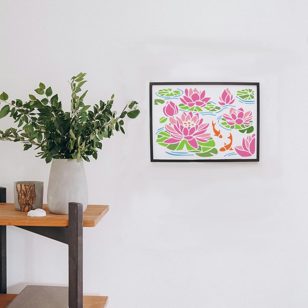 MAYJOYDIY Lotus-Teich-Schablone, Koi-Teich-Schablonen, Sommer-Lotusblätter, Bastelschablonen Mit Pinsel, Blumenpflanzen-Vorlage Zum Basteln Auf Fenster, Holz, Wand, Heimdekoration