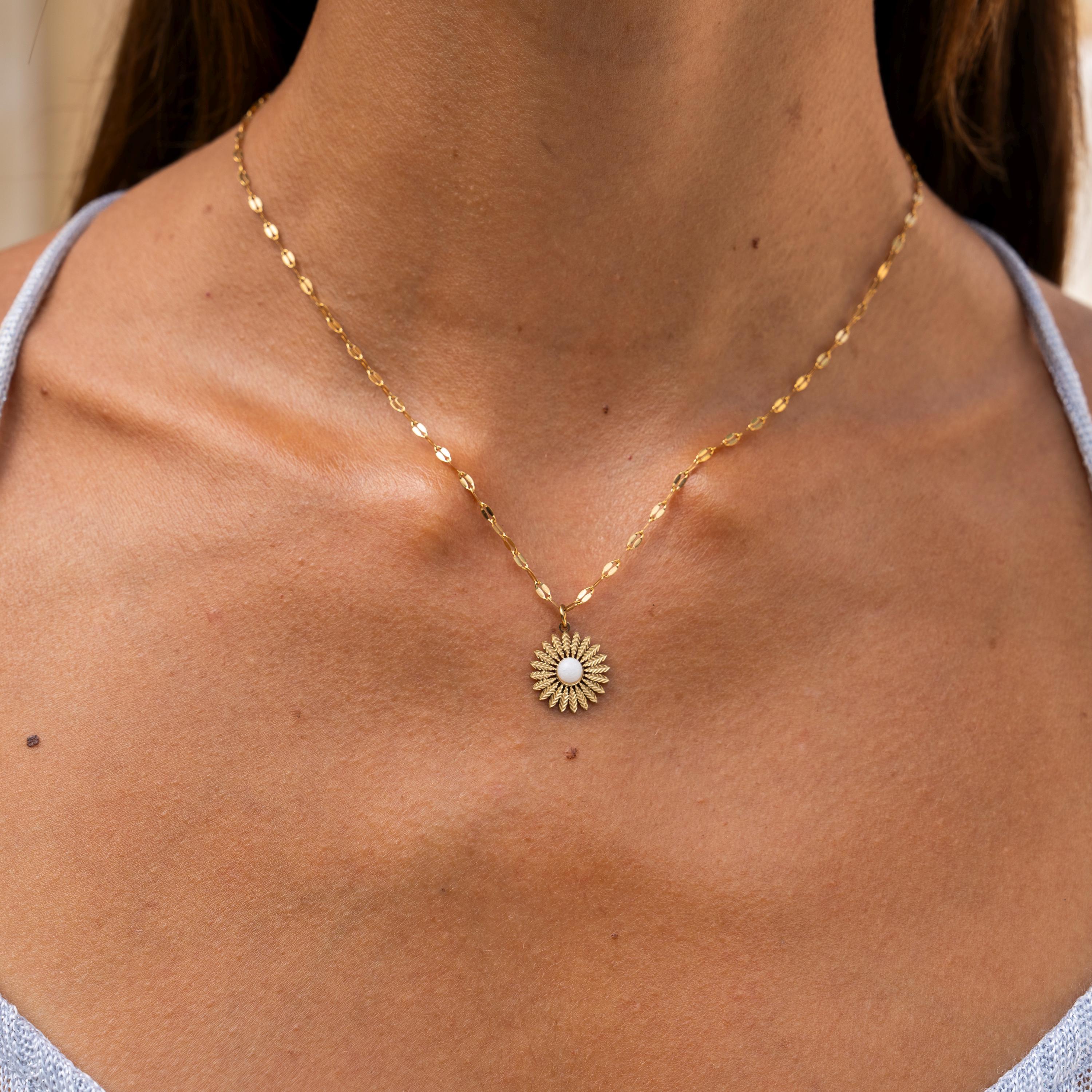 Made By Nami Sonnenblumen Halskette Damen Gold Aus Chirurgischem Edelstahl 40 + 5 Cm Gänseblümchen Kette Mit Edelstein Anhänger Wasserfester Schmuck Gold Boho Schmuck Damen (Türkis