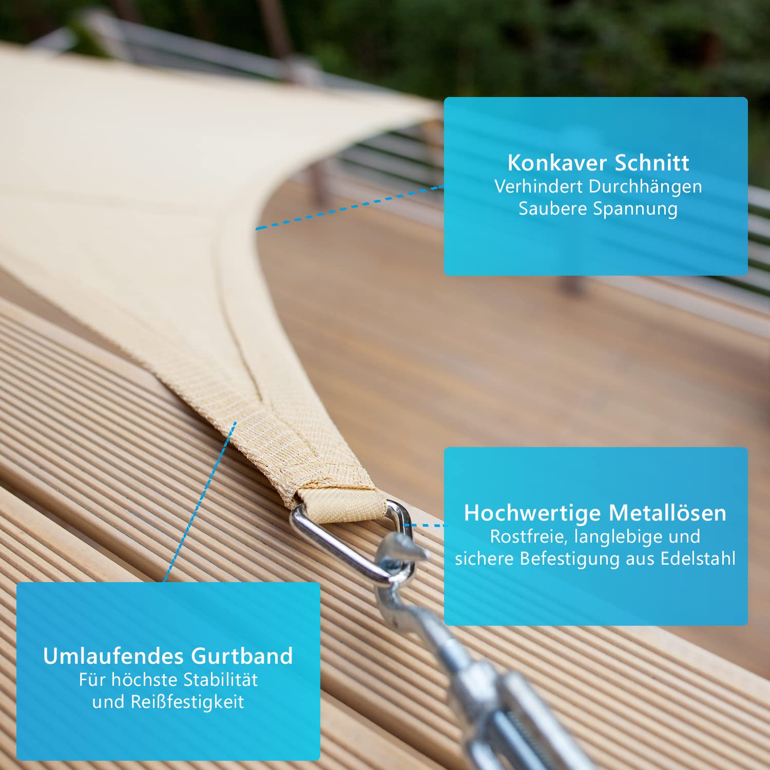 Einmal angebracht, ist das Produkt sehr pflegeleicht und einfach zu säubern: mit Gartenschlauch abspritzen und schon sieht es wie neu aus Unsere SunComfort Sonnensegel sind ein optimaler Schutz vor Sonnen- und UV-Strahlen für Ihren Garten, Terrasse oder beim Camping. Der Aufbau ist denkbar einfach: durch ihren konkaven Schnitt und mit den mitgelieferten Spannungsseilen können Sie das Segel sehr einfach, schnell und glatt anbringen. NYVI Sonnensegel SunComfort Erfahre den ultimativen Komfort mit NYVI's SunComfort Sonnensegel, dem idealen Schattenspender für Deinen Garten oder Terrasse. SolVision HS9 Sonnensegel 200x400cm rechteckig Creme HDPE Einmal angebracht, ist das Produkt sehr pflegeleicht und einfach zu säubern: mit Gartenschlauch abspritzen und schon sieht es wie neu aus. Du musst Dir keine Sorgen mehr um ein durchhängendes Segel machen, dank des konkaven Schnitts. Das SunComfort Sonnensegel kommt mit allem, was Du brauchst: Spannungsseile für die Ecken und eine detaillierte Montageanleitung. Einmal montiert, ist die Pflege ein Kinderspiel - einfach mit dem Gartenschlauch abspritzen und es sieht aus wie neu NYVI Sonnensegel SunComfort 2x3 m Rechteckig Weiss - Profi Sonnenschutz aus HDPE-Gewebe - UV-Schutz, Wetterfest, Atmungsaktiv, Reißfest - Schutz Markise für Garten Balkon & Terrasse - Kostenloser Versand ab 29€. Jetzt bei bestellen Im Lieferumfang befindet sich das Sonnensegel in der gewünschten Farbe, Spannungsseile für die Ecken und eine detailierte Aufbauanleitung mit nützlichen Zusatz-Informationen zur optimalen Bespannung des Segels. als Sunblocker für die Terrasse, Sonnenschutz auf dem Balkon, Sichtschutz im Garten oder Schattenspender für die Teichanlage Verarbeitung: reißfestes Gewebe, Doppelnähte, Edelstahlbefestigung an den Ecken Material: Premium HDPE-Gewebe (High Density Polyethylen), Form: rechteckig Durch die Verwendung von Doppelnähten und rostfreier Edelstahlbefestigung an den Ecken kann das Sonnensegel extrem straff gespannt werden. als Sunblocker für die Terrasse, Sonnenschutz auf dem Balkon, Sichtschutz im Garten oder Schattenspender für die Teichanlage. Durch die Verwendung von Doppelnähten und rostfreier Edelstahlbefestigung an den Ecken kann das Sonnensegel extrem straff gespannt werden Montage: Sehr einfach, detail Die umlaufend eingenähten Gurtbänder mit Doppelnähten und die rostfreien Edelstahlösen ermöglichen eine einfache Befestigung und eine dauerhaft straffe Spannung. Sonnen Schutz Für Terrasse NYVI Sonnensegel SunComfort 3x4 M Rechteckig Graphit - Profi Segeltuch Meterware Jedes Segel wird separat zugeschnitten, vernäht und kontrolliert - Sie erhalten somit Sonnenschutz in absoluter Premium Qualität. Wähle Deine Lieblingsfarbe aus Graphit, Sand, Weiß, Creme oder Lime und mach Deine Außenbereiche attraktiver!