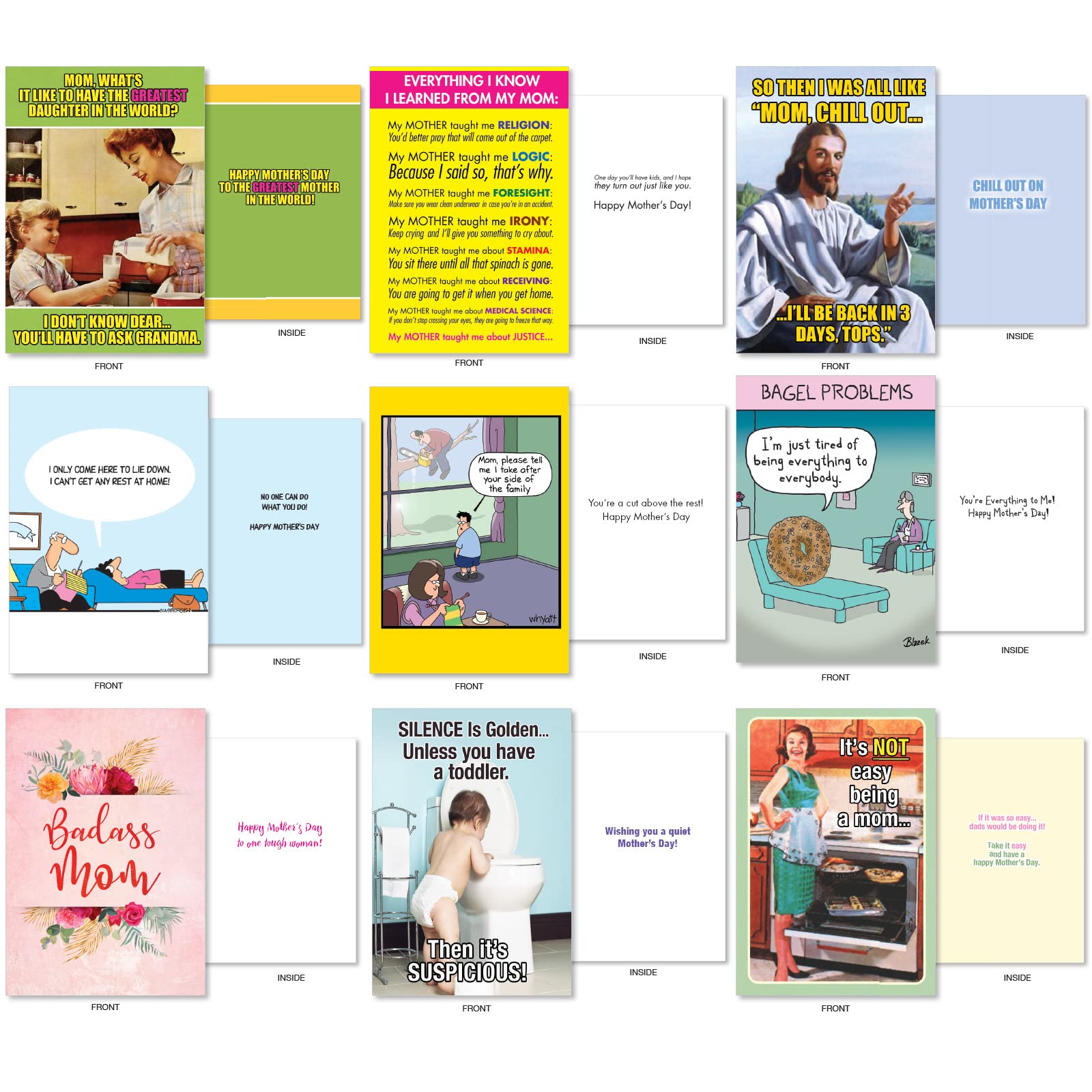 Größe – Set mit 10 verschiedenen Muttertags-Grußkarten. Viele Mütter in Ihrem Leben? Mutter, Stiefmutter, Großmutter, Schwiegermutter, Ehefrau, Partnerin? Wenn Sie das Glück haben, mit mehr als einer prächtigen Mama gesegnet zu werden, oder Sie einfach nur eine große und wunderbare Auswahl an Muttertags-Scherzkarten zur Auswahl mögen, um Ihre eine und einzige tolle Mama komisch und charmant zu feiern, dann ist die zehn Muttertagskartensammlung hier für Sie und sie/sie. Soziale Verantwortung: Unsere Produkte werden seit fast 40 Jahren in den USA (und Kanada) hergestellt. Beste Mama NobleWorks Muttertags-Grußkarten, Sortiert, Mit Umschlägen, 12,7 Frohe Weihnacht Innentext: "Happy Mother's Day, your highness!" Bezug – Moms Rule! · Kartengröße – Erhalten Sie 1 Karte in normaler Größe mit 12,7 x 17,8 cm Umschlag Verschiedene Nachrichten auf der Innenseite: Dies ist eine Auswahl an Grußkarten, wobei jede Karte ihren eigenen einzigartigen Gruß hat. Bitte überprüfen Sie alle Produktfotos sorgfältig, um zu sehen, was die Stimmung jeder Karte (und der Text des Titels) sagt. Jede Mutter wird ein gutes Lachen bekommen, wenn sie einen dieser lustigen, illustrierten und urkomisch beschrifteten Muttertagsgaggrüße erhält. Die Deckseiten der Karten sind auf beschichtetem Papier gedruckt und haben eine glänzende Oberfläche, während die Innenseiten der Karten unbeschichtet sind, für eine glatte und makellose Schreibfläche für Männer und Frauen. Aliens, Ameisenbären, Mäuse, Hamster, Hunde, Katzen, Pinguine, Vögel und Mama in einer Wanne sind alle humorvoll auf diesen bunten und garruösen Karten zu sehen, um Mas Herz zu wärmen und ihr Lächeln an ihrem großen besonderen Tag im Mai noch weiter zu verbreiten; mit freundlicher Genehmigung des Künstlers Dave Coverly, NobleWorks Cards und Sie als humorvollen und mütterliebenden Sohn, Tochter, Stiefkind, Enkelkind, Schwiegerin oder Ehemann/Partner. Muttertags DIY: 3 Grußkarten-Ideen Größe – Set mit 10 verschiedenen Muttertags-Grußkarten. Passt in einen 12,7 x 17,8 cm großen Umschlag. Alle Stile sind auch einzeln erhältlich. Verwendung
