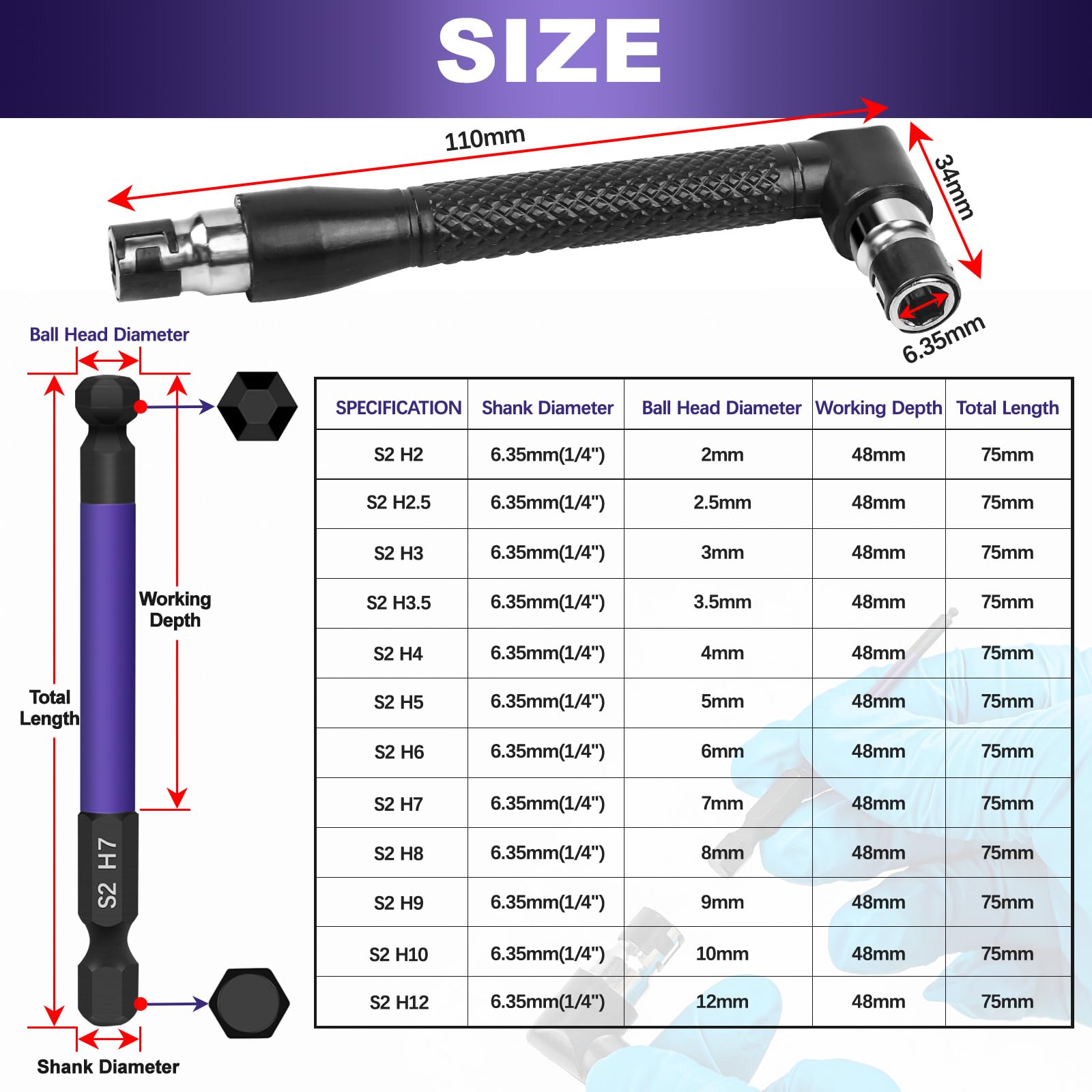 【Vielseitige Anwendungsmöglichkeiten】Inbus Schraubendreher Set mit 12 verschiedenen Größen (2 mm bis 12 mm) bietet Ihnen die Flexibilität, die Sie für Automobil-, Haushalts-, Fertigungs-, Bau- und Heimwerkerprojekte benötigen. Die phosphatgeschwärzte Oberfläche sorgt für Langlebigkeit und präzise Ergebnisse bei jeder Anwendung, selbst unter anspruchsvollen Bedingungen. Perfekt für Situationen, in denen der Platz begrenzt ist und eine hohe Flexibilität gefragt ist. Dies erhöht die Effizienz und minimiert Schraubenverluste., 3., Innensechskantschlüssel Set: Hergestellt aus hochwertigem S2-Stahl . 【Hochwertiges Material und präzise Verarbeitung】Dieser Sechskant Schraubendreher Satz besteht aus hochwertigem S2 Stahl, Hohe Härte und nicht leicht zu rosten. Der ergonomische Griff sorgt für komfortable Handhabung., 5., Ball End Hex Bit Satz: Jeder Schraubendreher im Set ist mit aufgedruckten Spezifikationen zur einfachen Identifizierung ausgestattet und kommt mit einem praktischen Bit-Griff. Dies reduziert das Risiko von Beschädigungen und erhöht Ihre Arbeitsgeschwindigkeit und Effizienz, was die Bearbeitung von Aufgaben deutlich vereinfacht. Technische Daten: Produktname: Kugelkopf Schraubendreher Bit Set Material: Stahl Farbe: lila, schwarz (wie Bild) Schaft: 1/4 Zoll Sechskantschaft Größe: 2 mm, 2,5 mm, 3 mm, 3,5 mm, 4 mm, 5 mm, 6 mm, 7 mm, 8 mm, 9 mm, 10 mm, 12 mm Länge: 75 mm Typ: Kugelkopf Packungsinhalt: 12 * Kugelkopf Schraubendreher Bit 1 * Schraubendreherhalter 1... Inbus Bit Set QUARKZMAN 2 Stück Kugelkopf Innensechskant Schraubendreher 2,5 Mm Inbus Schraubendreher Set Die phosphatgeschwärzte Oberfläche bietet hohe Präzision und Langlebigkeit, ideal für präzise Arbeiten und langfristige Nutzung., 4., Hex Schraubendreher Innensechskantschlüssel Set: Der Kugelkopf ermöglicht das Arbeiten unter einem Winkel von bis zu 25 Grad, wodurch Sie Schrauben auch in schwierigen Positionen problemlos erreichen können. 【Praktisches Design für begrenzten Platz】Der Innensechskant Schraubendreher mit Kugelkopf ermöglicht das Arbeiten in vertikaler oder geneigter Position, was besonders nützlich in schwer zugänglichen Bereichen ist. 9 teiliges Sechskant Schraubendreher Bit Set, Rostfreier S2 Stahl Das Set ist kompakt und ideal für den mobilen Einsatz. 12 Stück Kugelkopf Sechskant Schraubendreher Bit 75 mm 1/4" Magnetischen Innensechskant Schlagschrauber Bits Satz 2/2,5/3/4/5/6/8/10/12 mm S2 Ball End Hex Bit Satz Innensechskantschlüssel Set