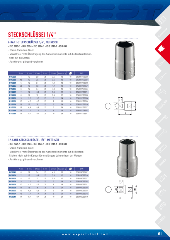 Bahco 1/4 Zoll Standardbuchse Steckschlüsseleinsatz SW 5.5mm Bahco 1/4 Zoll Standardbuchse Steckschlüsseleinsatz SW 5., 5mm 6-Punkt x 24., 7 mm , Handwerkzeuge Nicht geeignet zur Benutzung mit Maschinen. Produktdetails Artikeltyp Steckschlüssel-Einsätze Lieferanten Artikel-Nr. 509-4230 Gewicht 1 g Zustand Neu Technische Daten Antriebsgröße 1/4 Zoll Antriebstyp Vierkant Finish Nickel verchromt Gesamtlänge 24.7 mm Material/Stoff Chrom-Stahl Extra Metrisch oder zöllig zöllig Steckschlüssel Typ Standardbuchse Steckschlüssel-Kopftyp 6-Punkt Steckschlüsselgröße 9/32Zoll... Bestellen Sie Bahco 1/4 Zoll Standardbuchse Steckschlüsseleinsatz 5.5mm 6-Punkt x 24.7 mm 6700SM-5.5 or weitere Steckschlüssel-Einsätze online - versandkostenfrei ab 100 € Nettobestellwert bei RS Components Schraubenschlüssel, Steck- & Ratschenschlüssel , Steckschlüssel-Einsätze 6,3 mm (1/4 ”)-Vierkantantrieb · für Schrauben mit Innensechskant-Profil · CV-Stahl · TIN beschichtet · DIN 7422